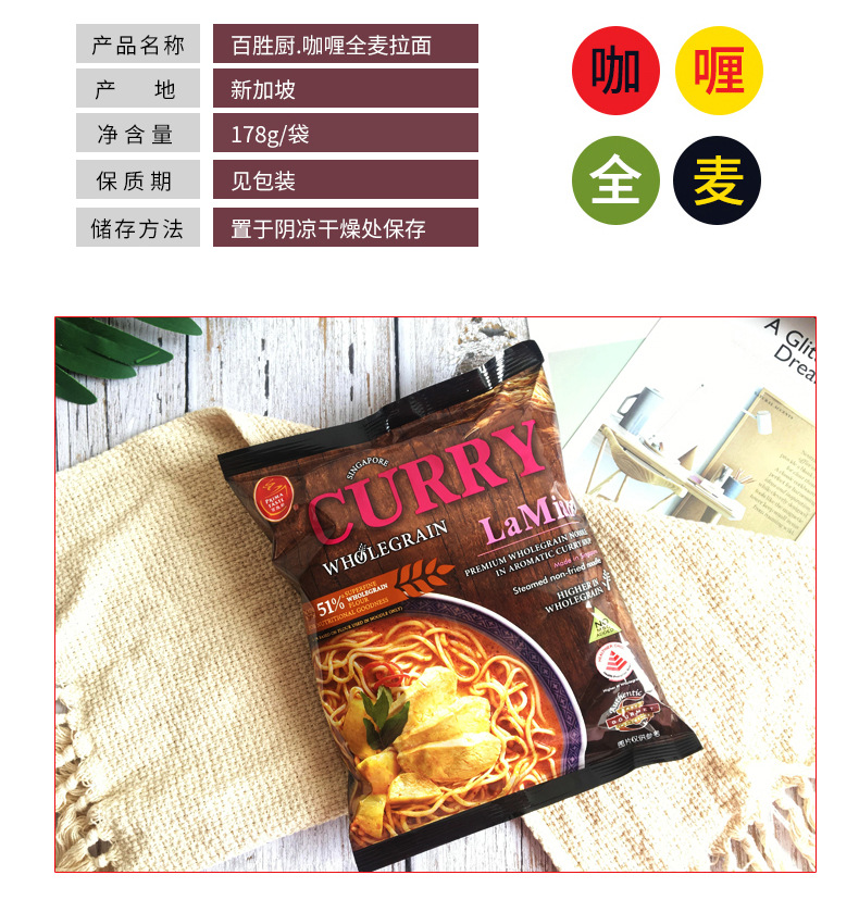 新加坡進口 百勝廚叻沙咖喱風味全麥拉面速食面非油炸方便面