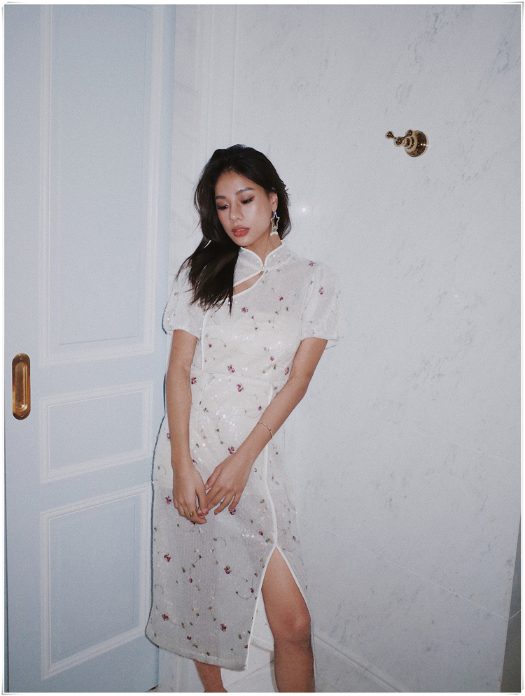 【清貨折XS】Mimi Plange夏新繁花朵朵水晶亮片刺繡旗袍連衣裙