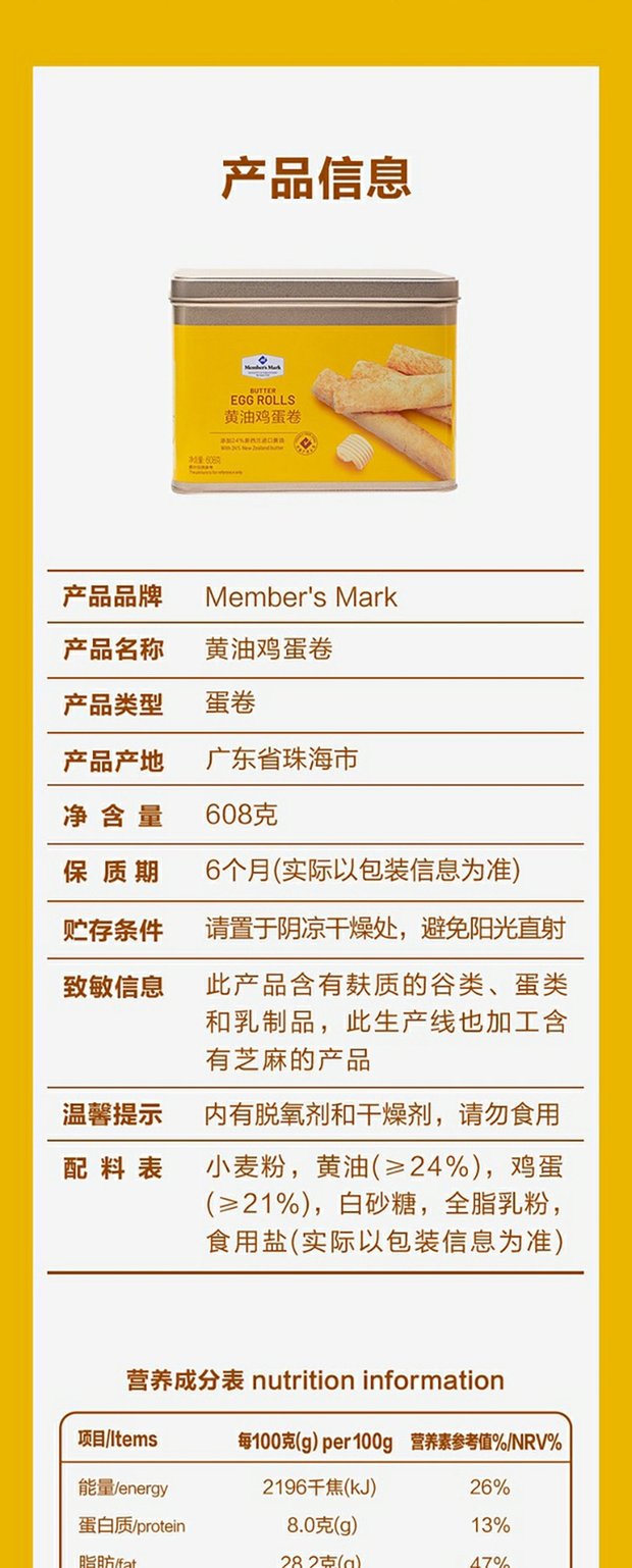 山姆會員店Member's Mark黃油雞蛋卷餅干香濃酥脆鐵罐禮盒裝608g
