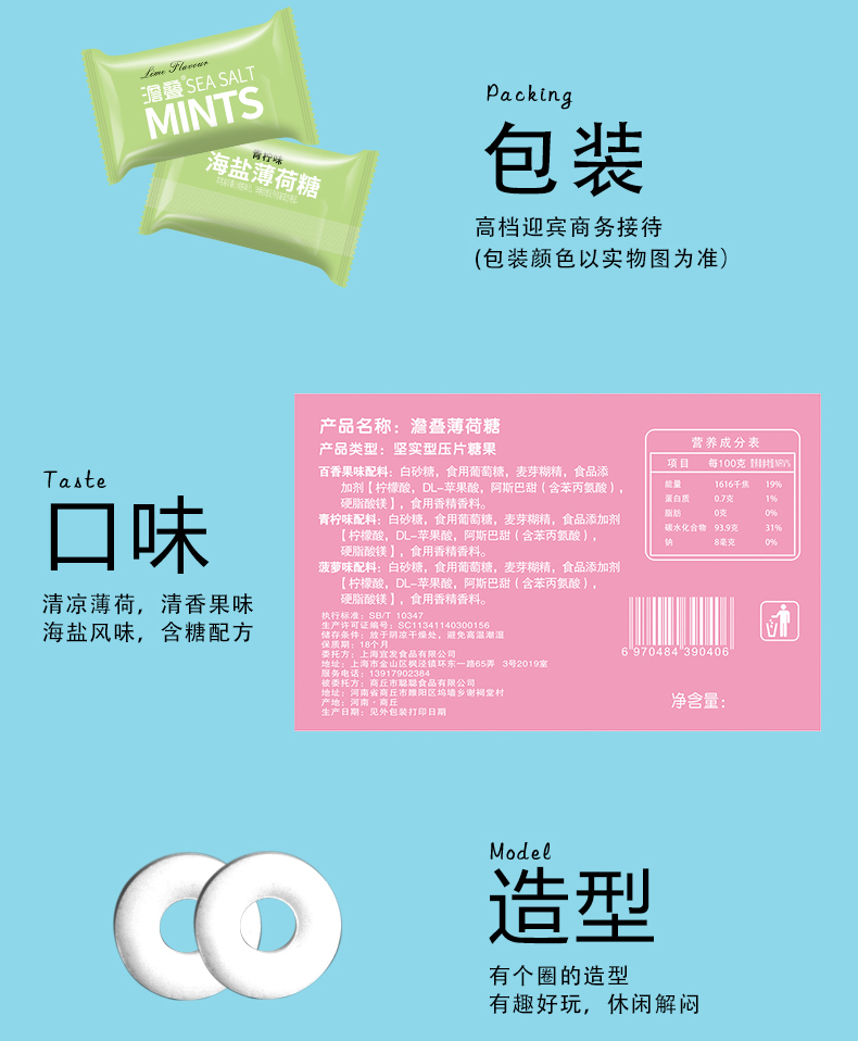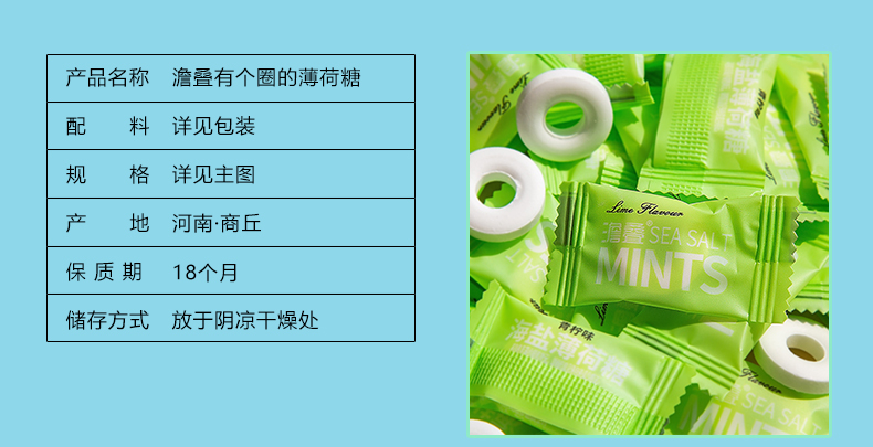 澹疊海鹽青檸薄荷糖 150g大約100粒有個圈的青檸口味壓片糖果零食