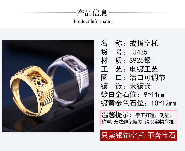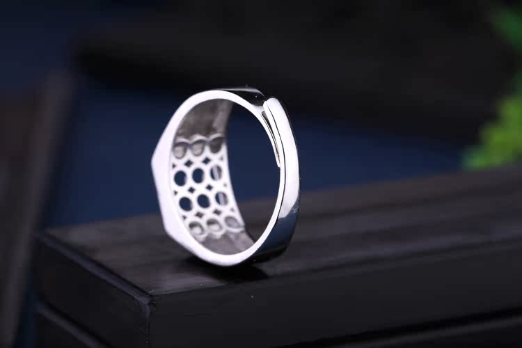 S925純銀戒指空托男士戒托鑲嵌綠松石蜜蠟開口方戒托 10*12
