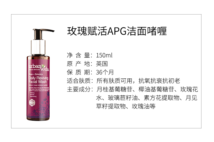 英國優薇達urbanveda玫瑰洗面奶抗氧APG男女潔面啫喱深層清潔毛孔