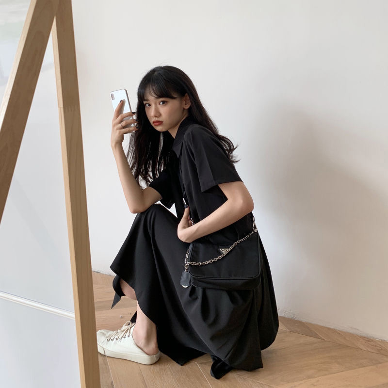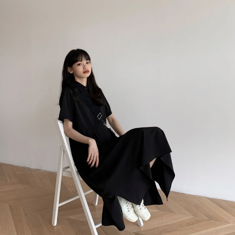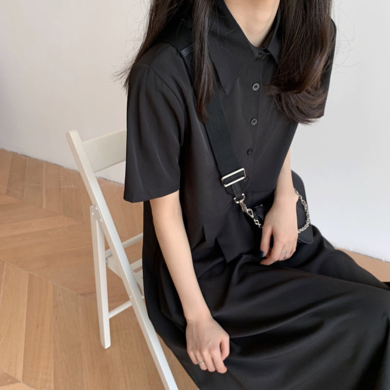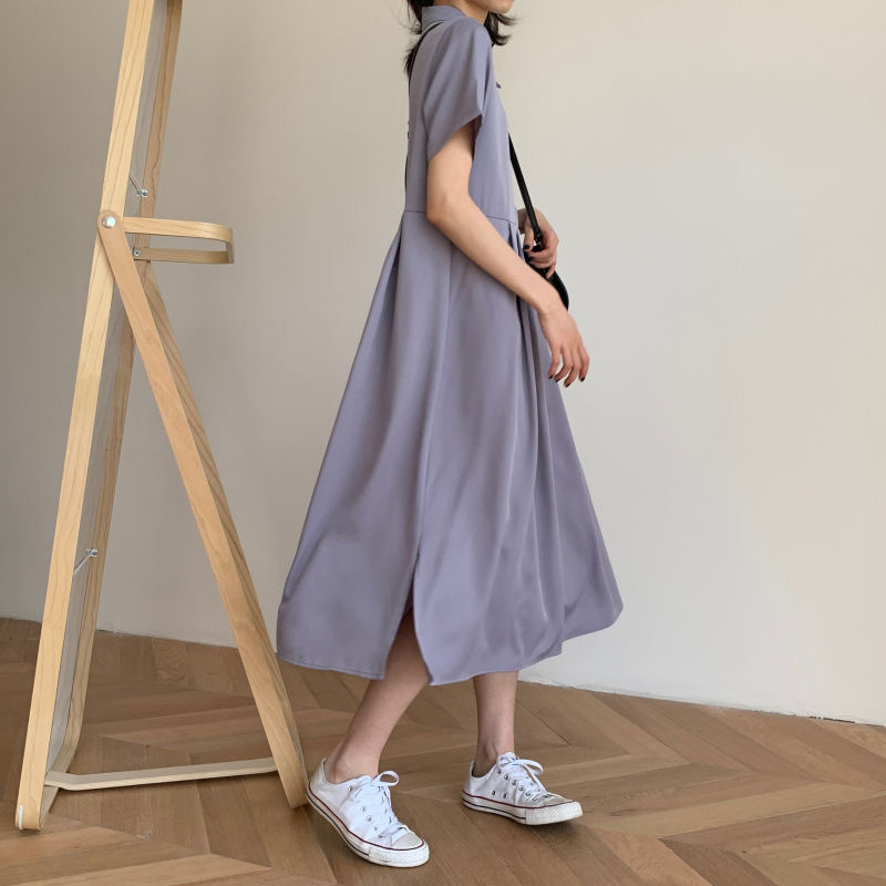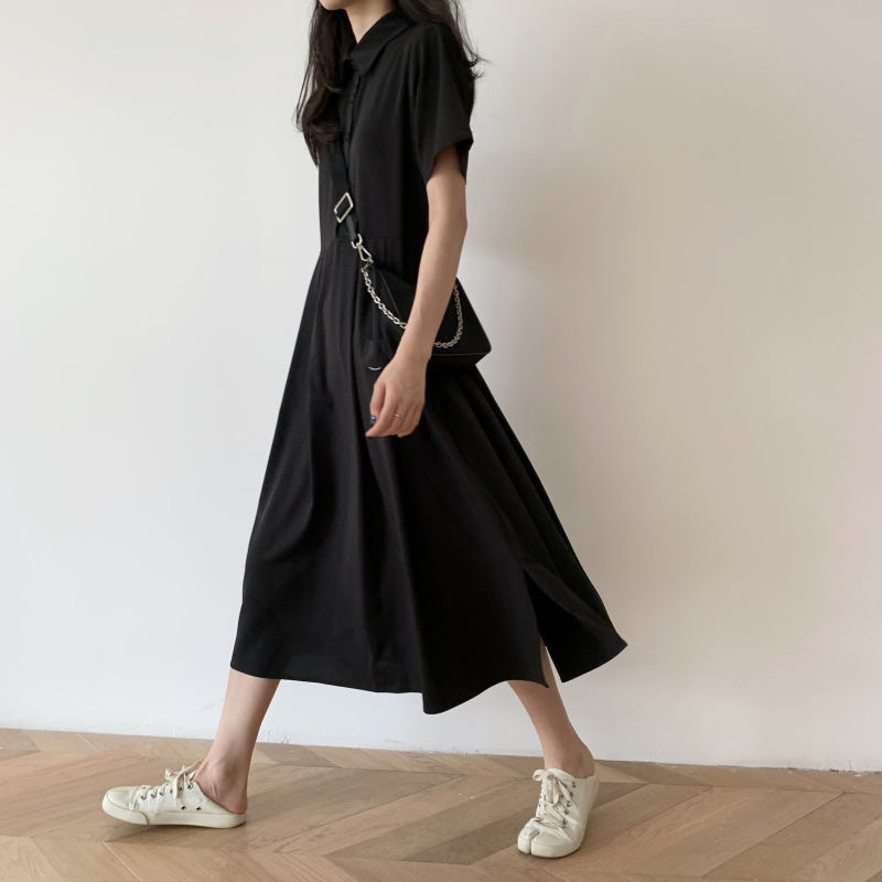中長款短袖連衣裙2023夏季新款百搭中長款裙子韓系百搭復古溫柔裙