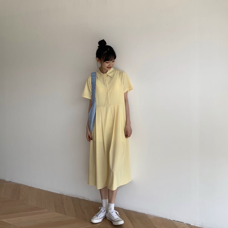 百思朵ins鵝黃色連衣裙女顯瘦短裙
