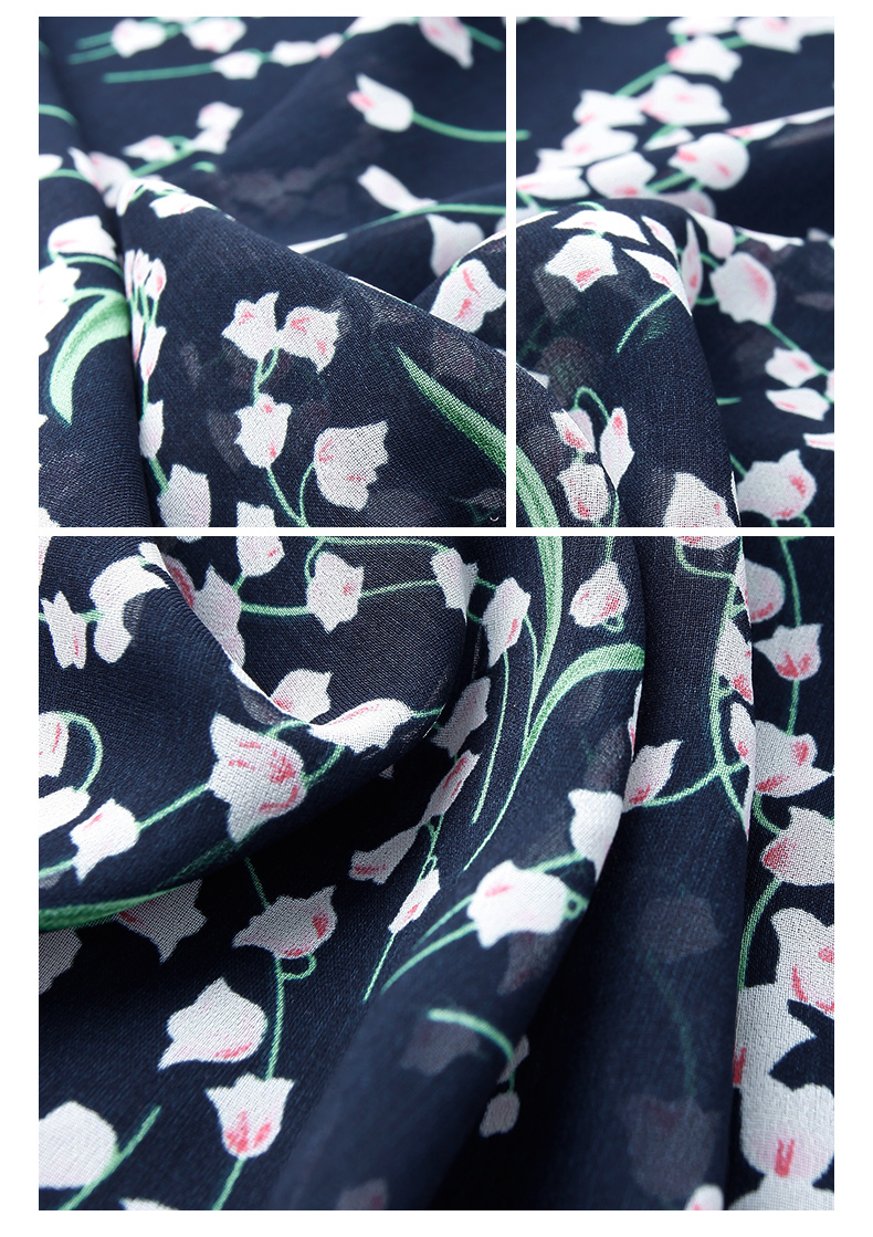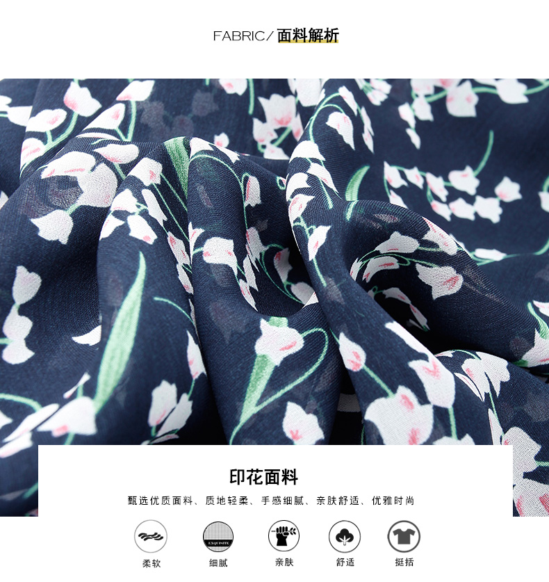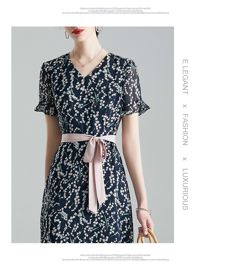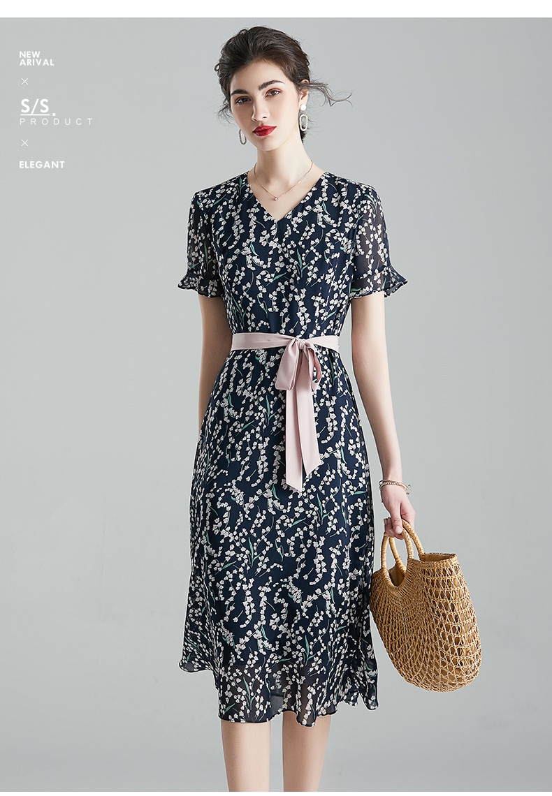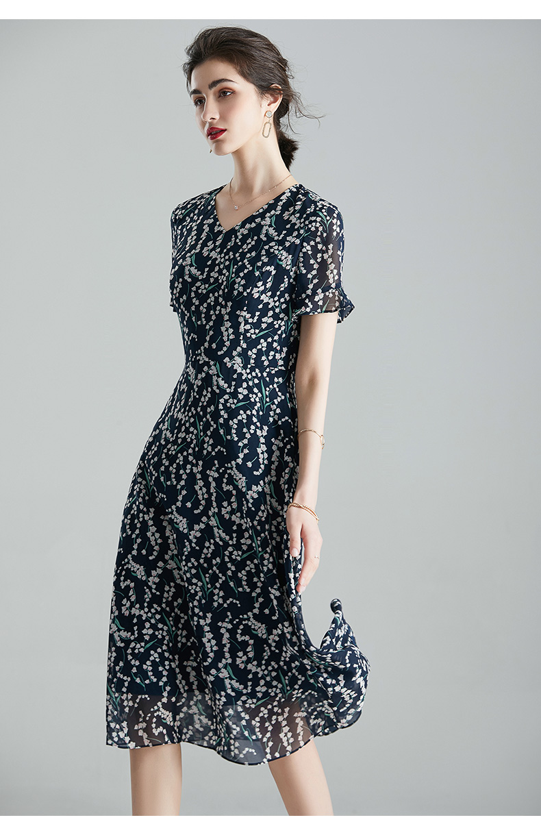 【1件7.9折】夏裝新品百搭顯瘦V領雙縐印花裙中長款短袖連衣裙