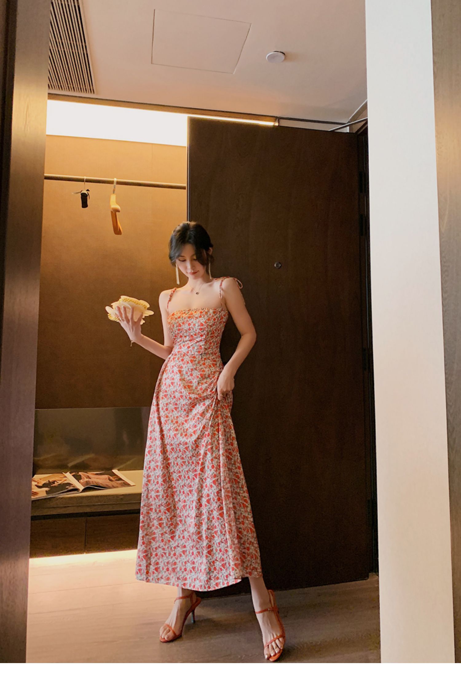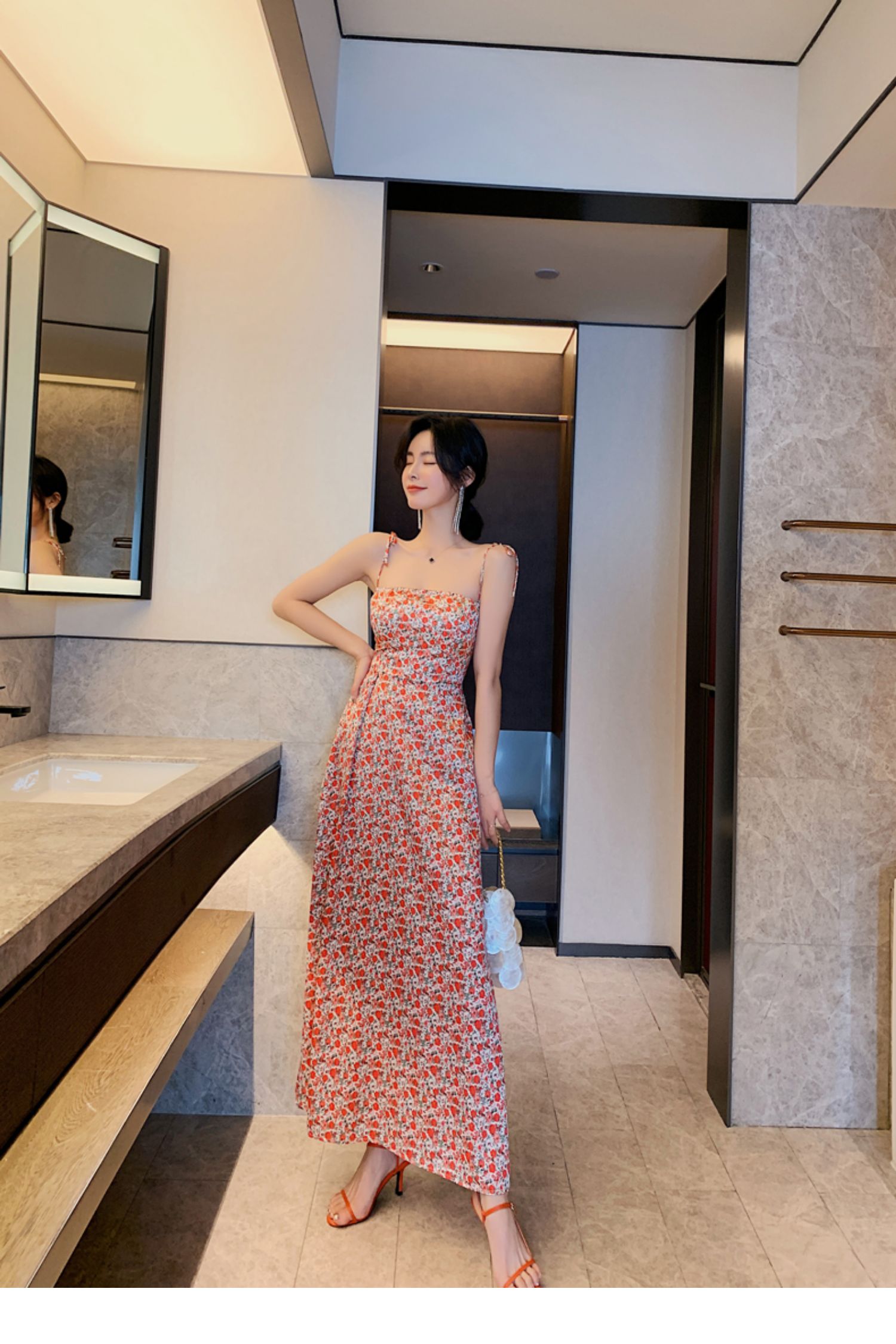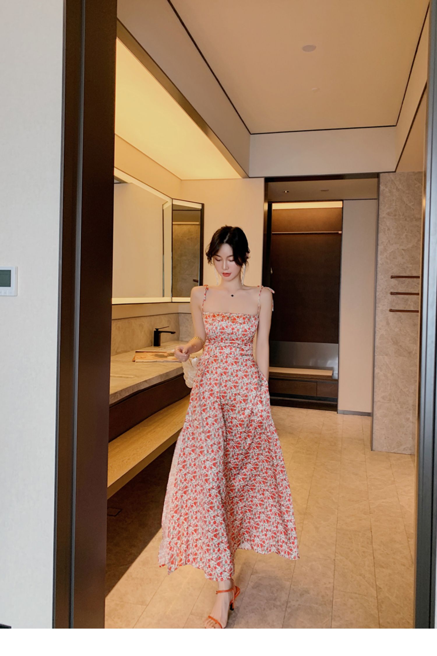 中長款雪紡連衣裙夏季新款2023法式復古桔梗碎花小雛菊吊帶中長裙