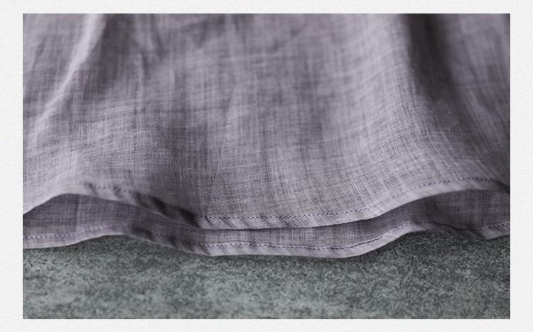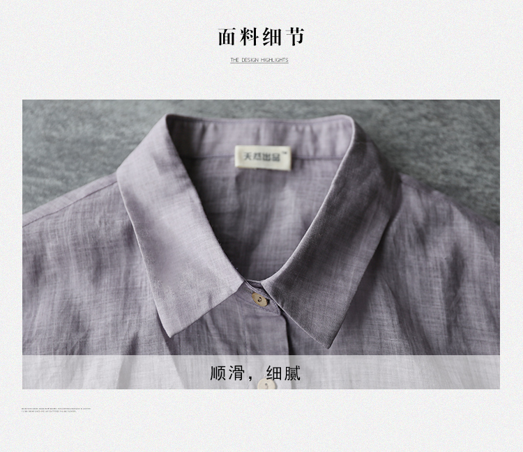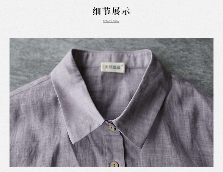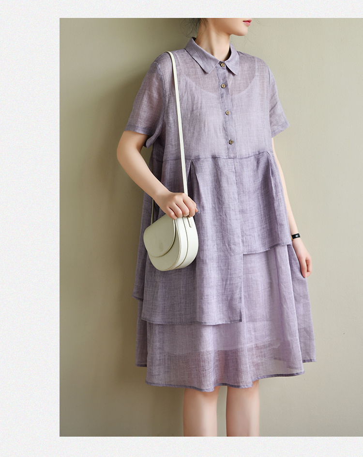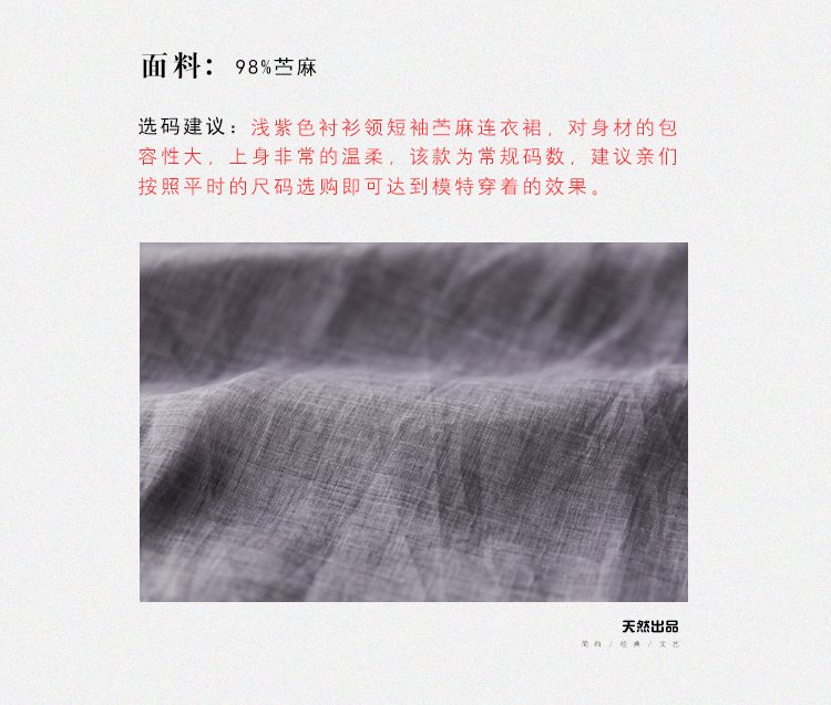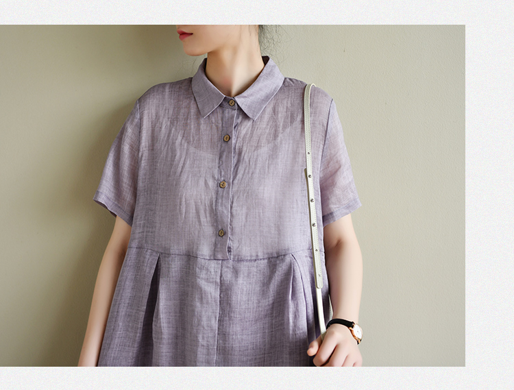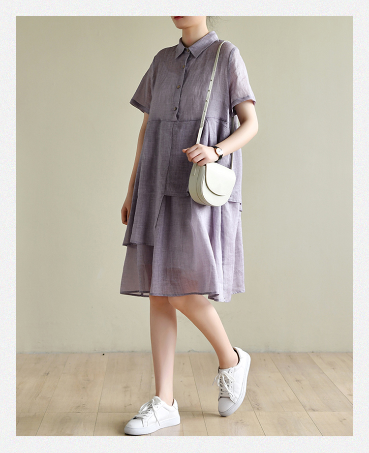 天然出品 休閑文藝淺紫色襯衫領短袖苧麻連衣裙夏QA2377