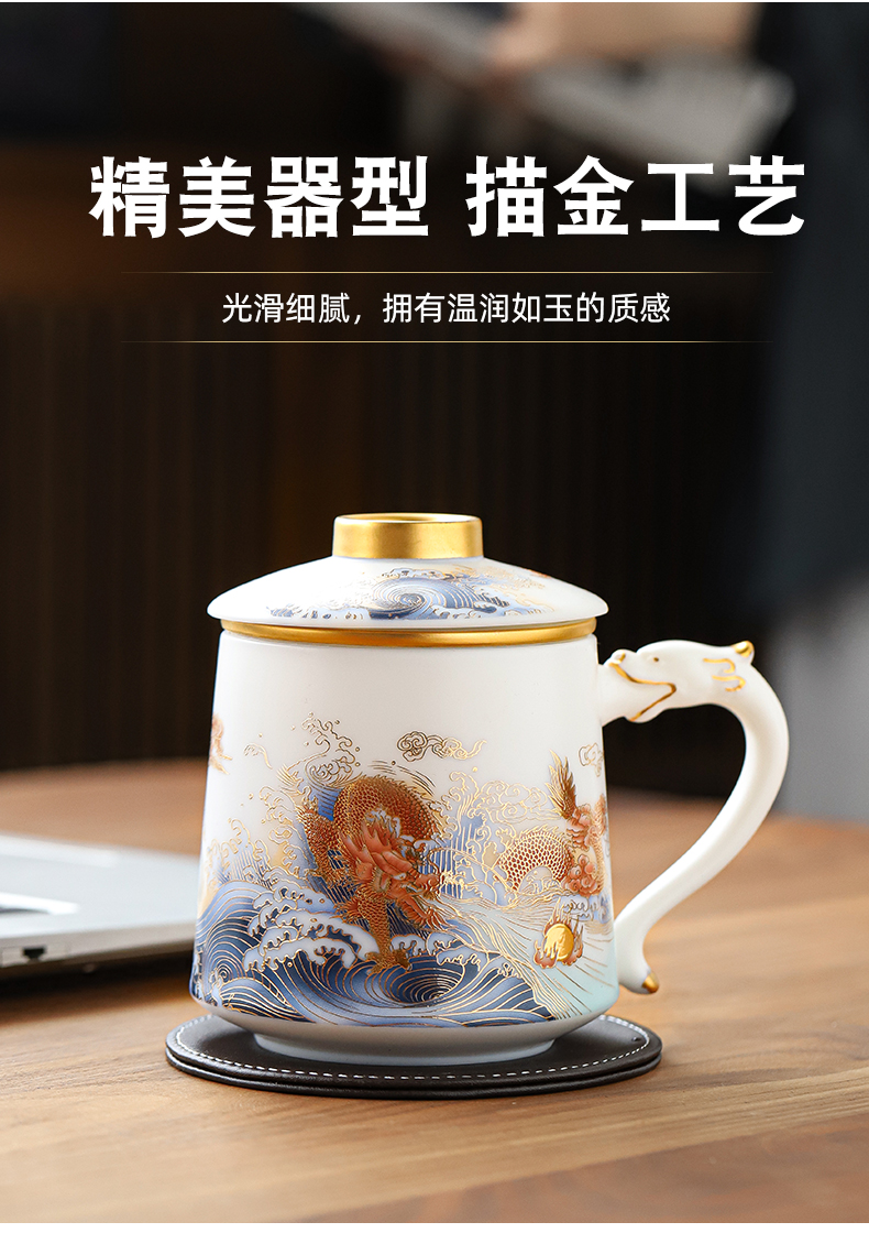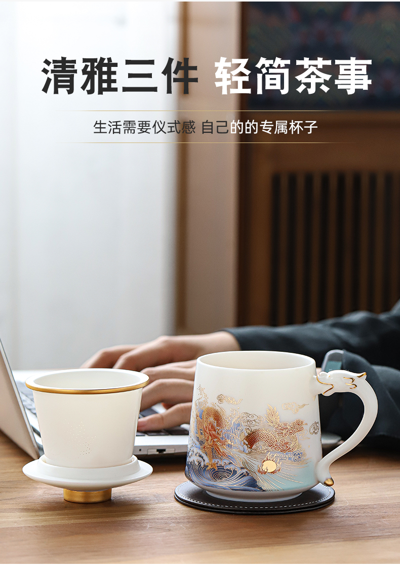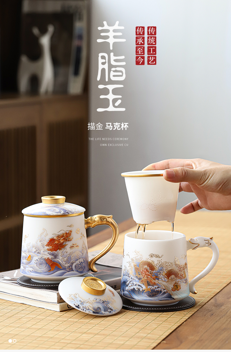 鎏金羊脂玉辦公杯帶蓋過濾陶瓷杯