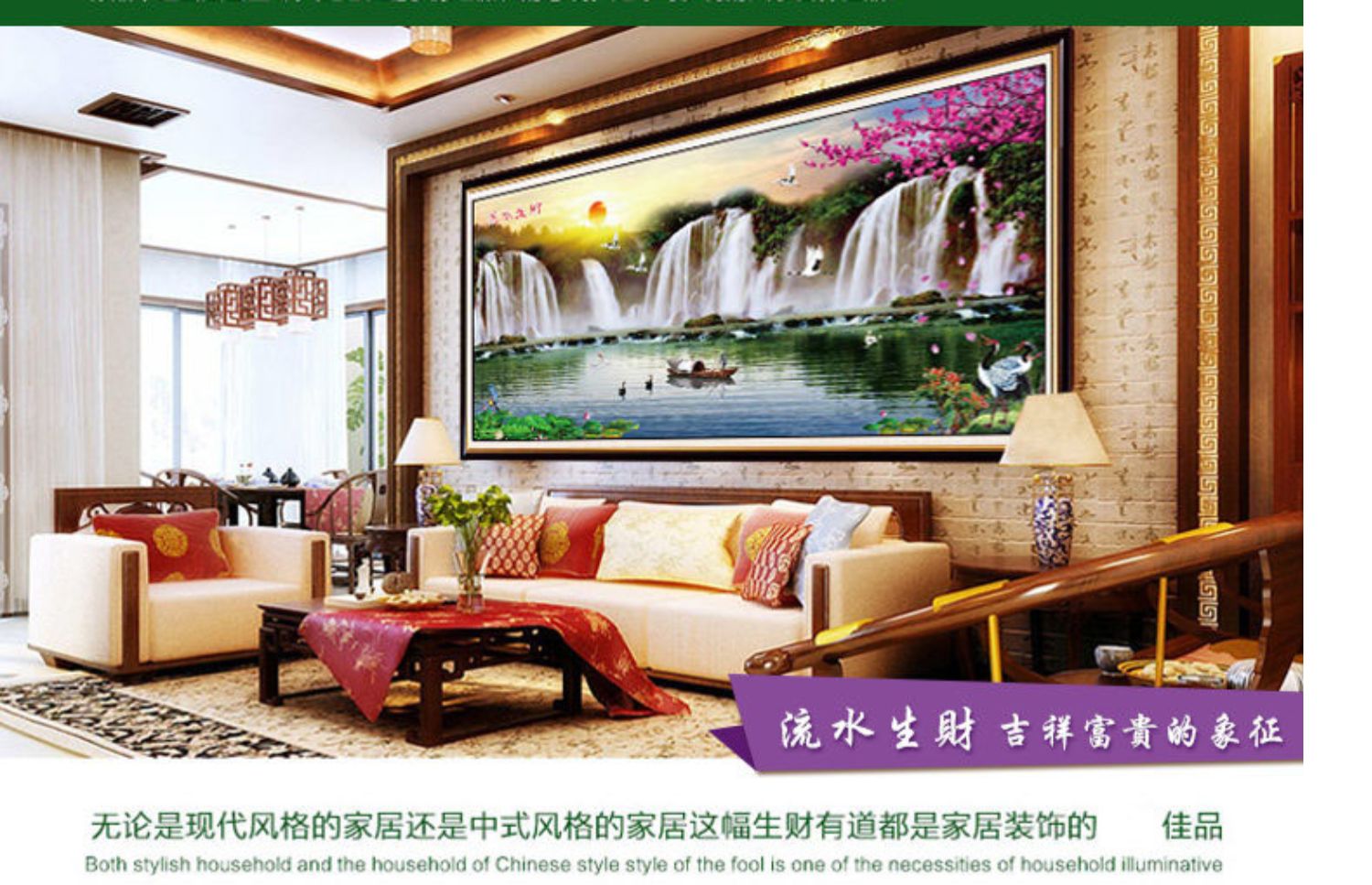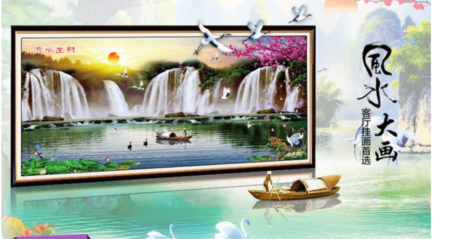 流水生財滿繡十字繡線繡新款客廳臥室簡約現代大幅山水掛畫風景