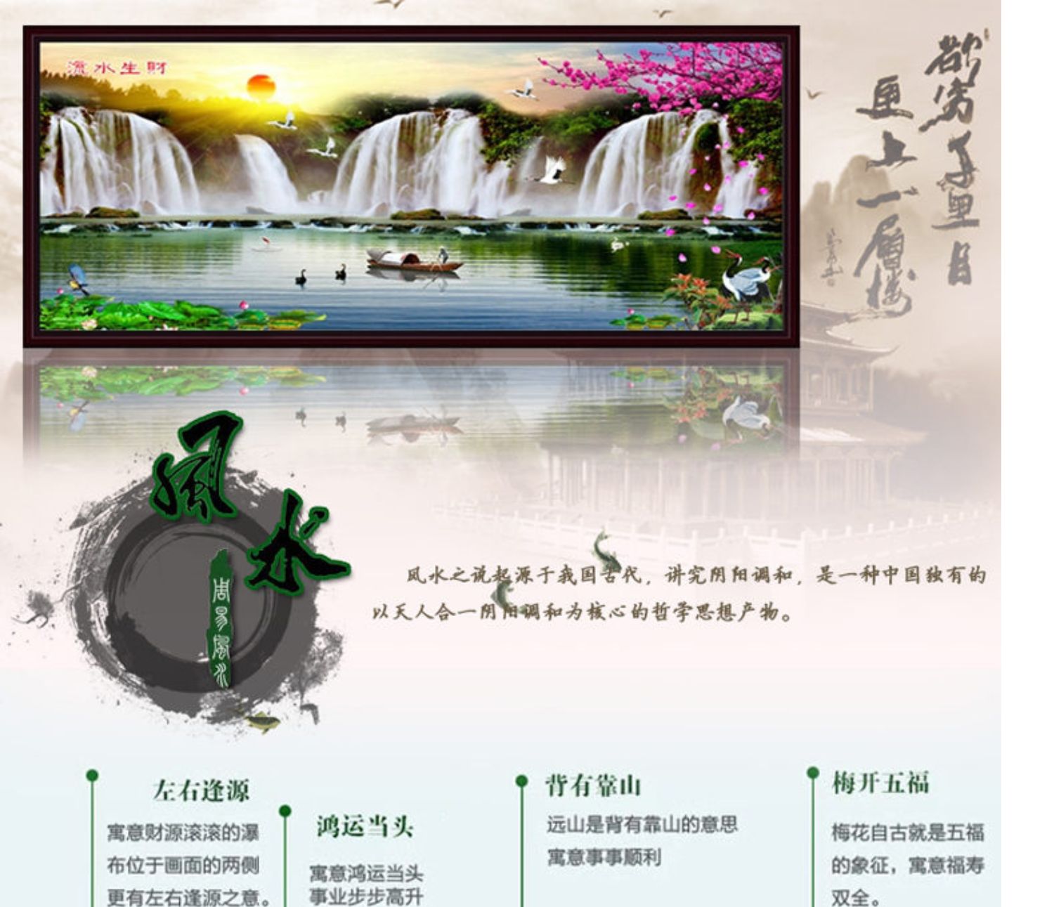 青飛流水生財財源滾滾仙鶴有十字繡