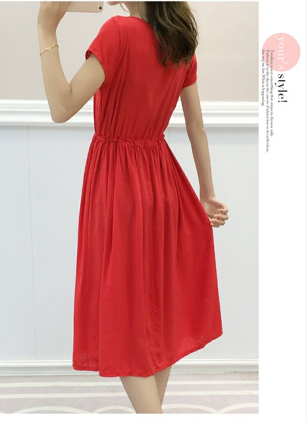 夏季時尚新款人造棉抽繩碎花連衣裙