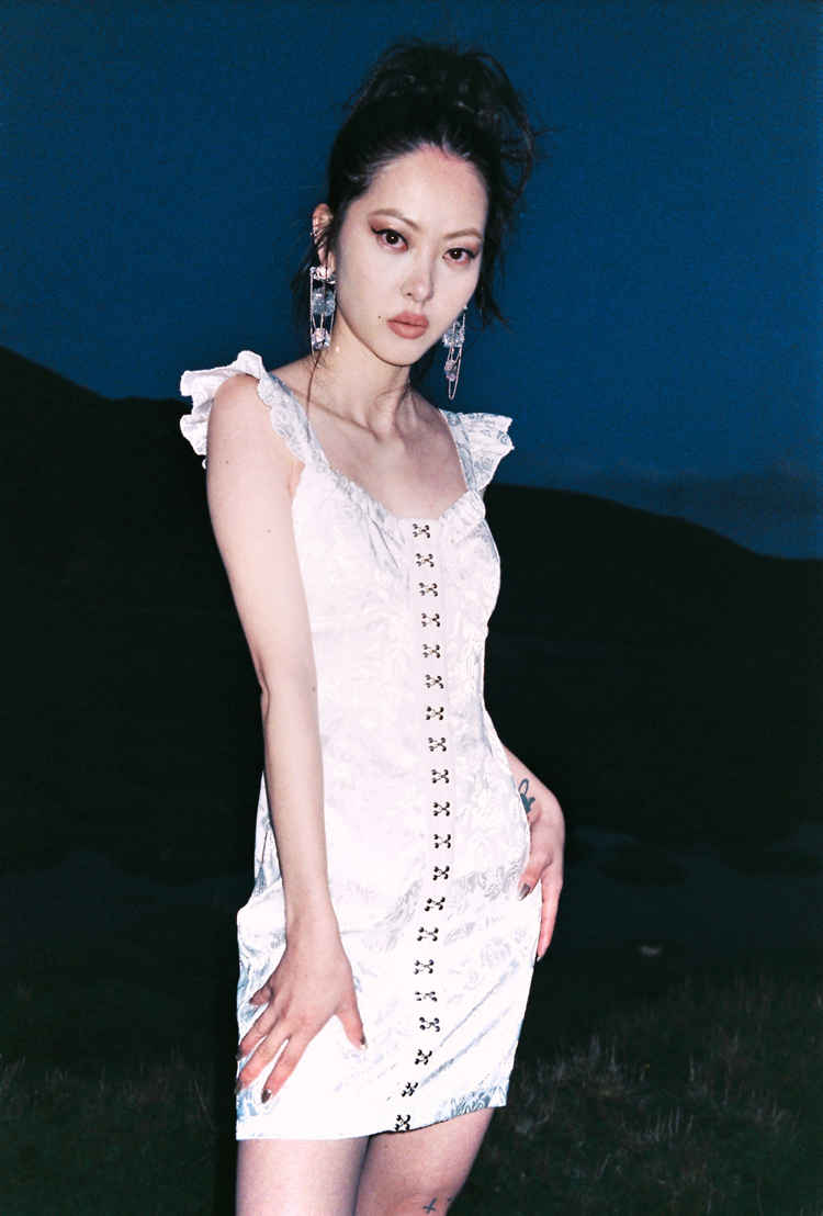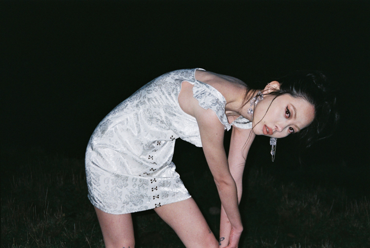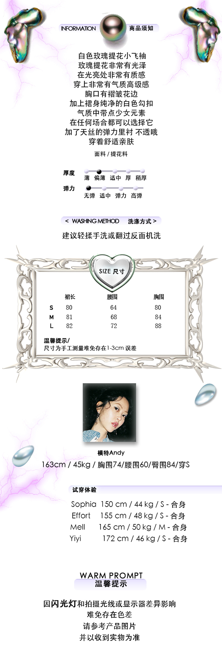EhK原創設計白色仙氣玫瑰提花 勾扣飛袖連衣裙