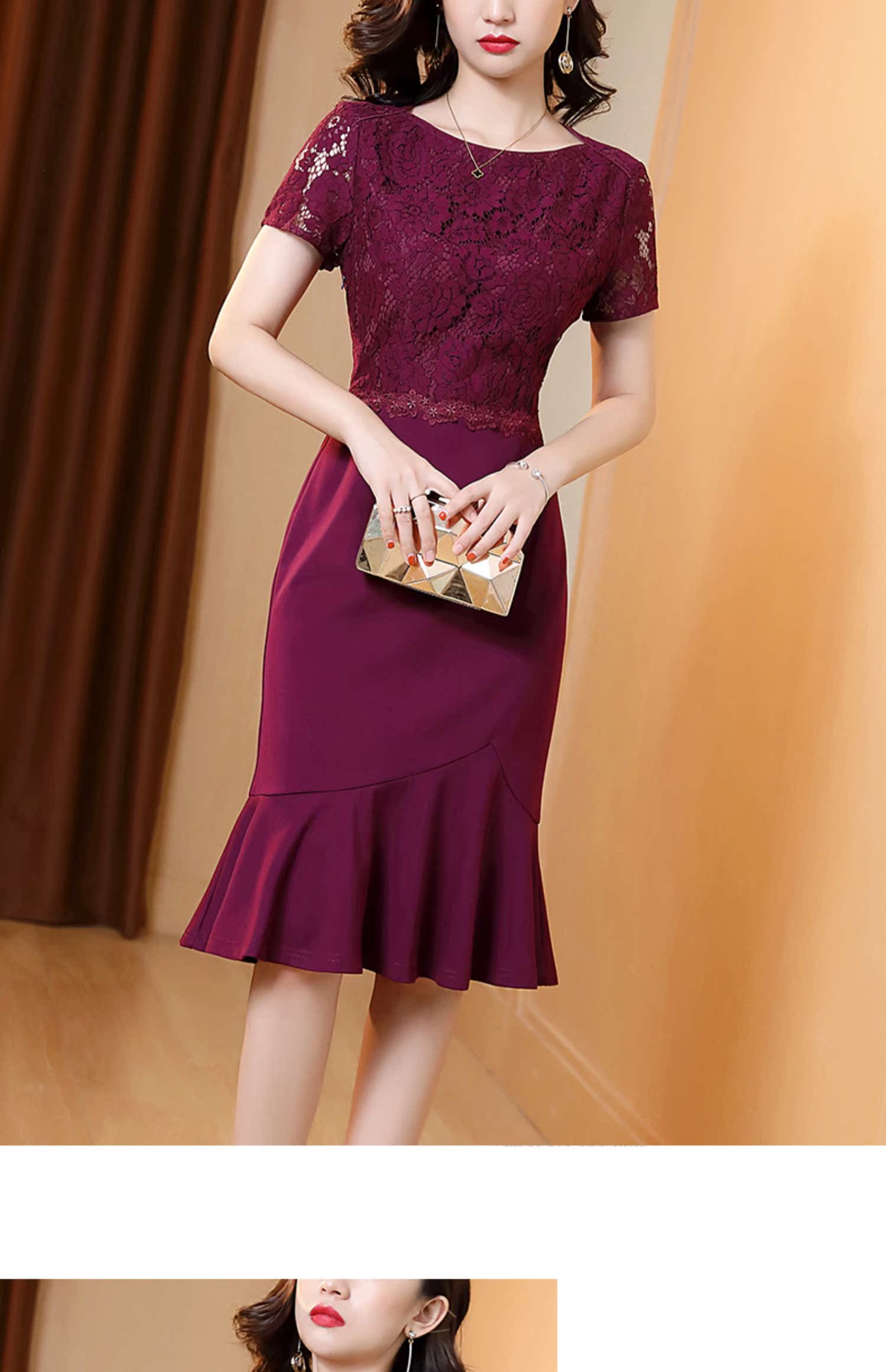 鏤空蕾絲連衣裙女秋2023新款短袖高腰宴會禮服拼接修身包臀魚尾裙