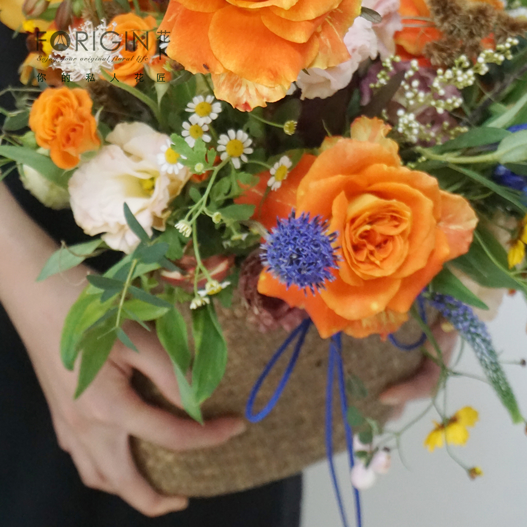 田園風花籃整體風格使用較多葉材和線性花材,請知曉,容器為田園類花籃,籃型款式隨機。;
