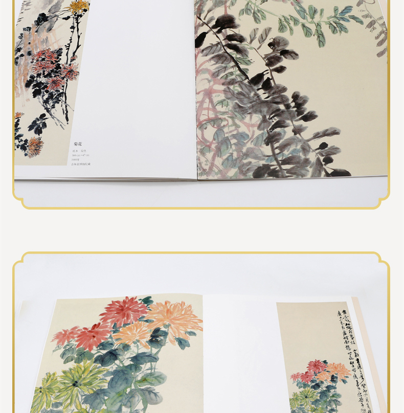 本書為其花鳥篇第三冊,書中主要展示吳昌碩花鳥精品畫作多幅,主要為清供圖,有果蔬、文房、青銅古玩等雜件。他摻以篆法,用筆老辣,線條渾厚遒勁,雖是繪制文房案幾普通之物,在濃重的金石筆墨中也別具一番文人的雅致。