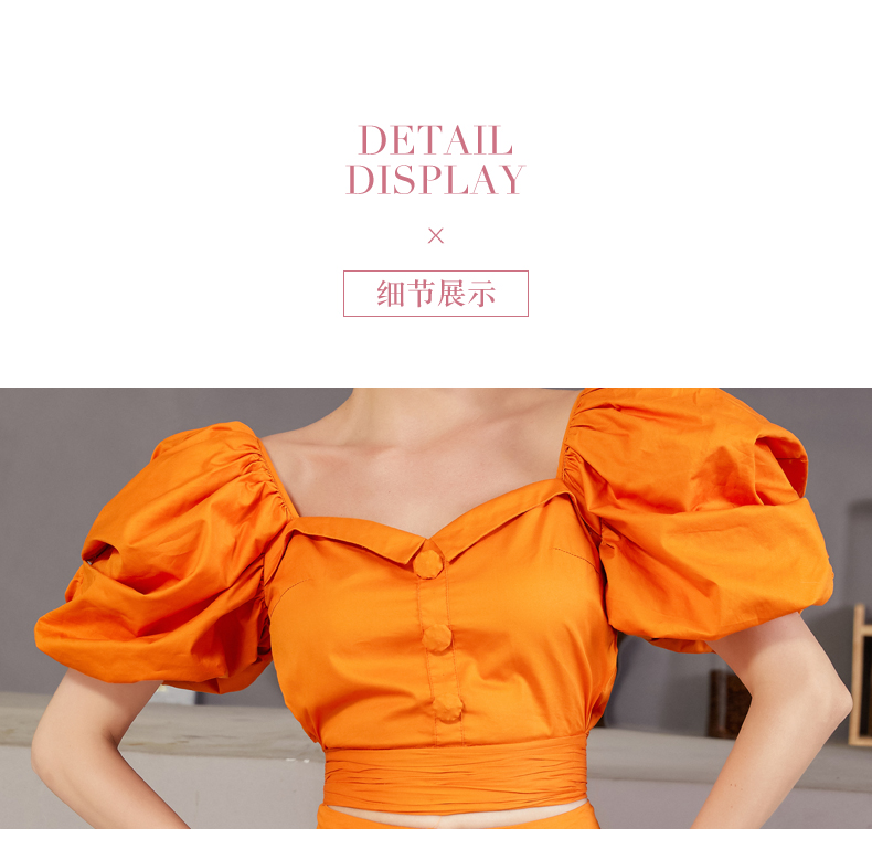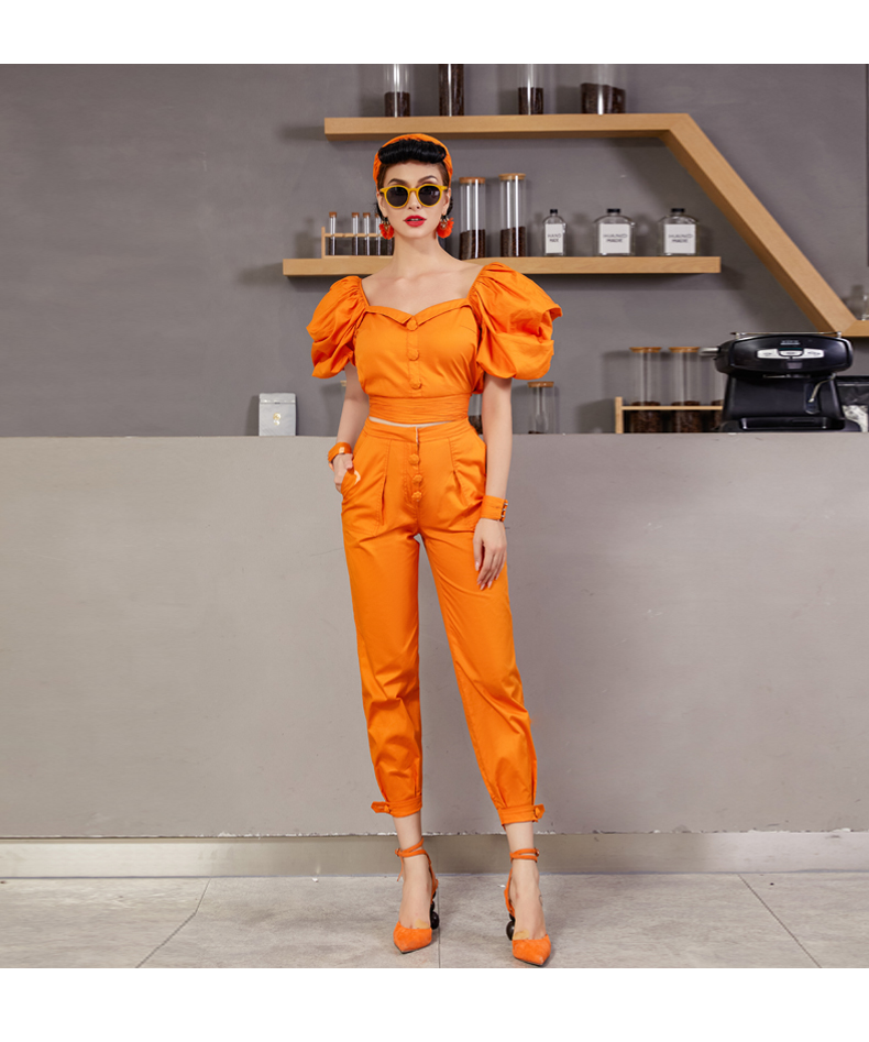 LEEDYME2020新款復古典雅時尚 泡泡袖抹胸上衣九分蘿卜褲束腰套裝