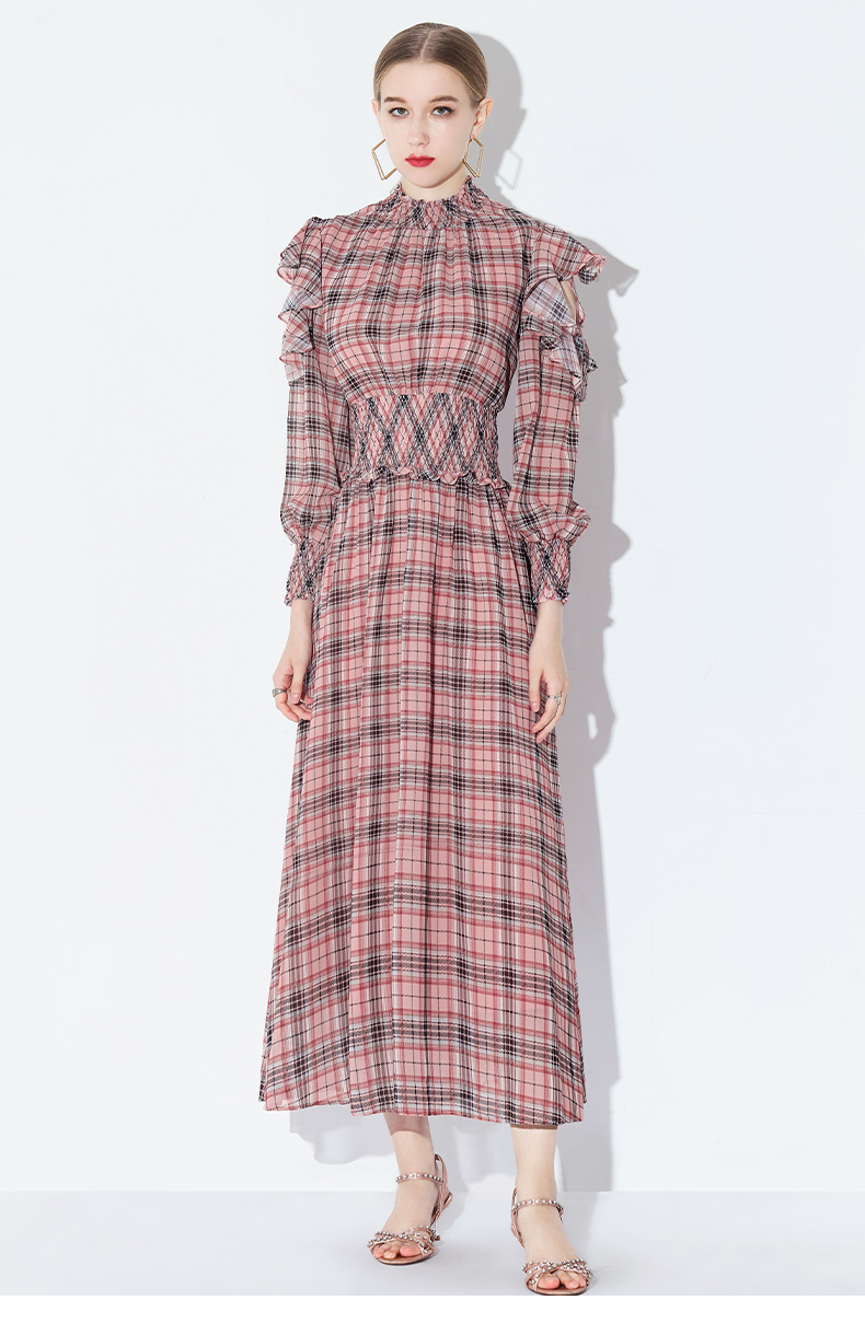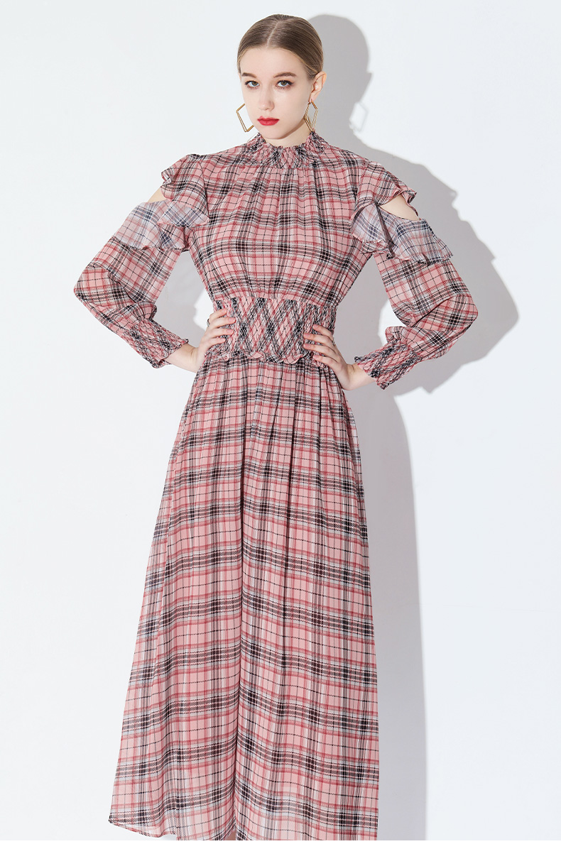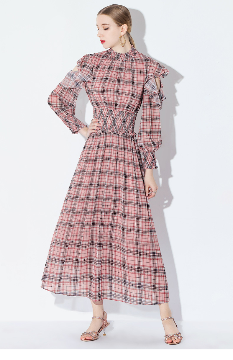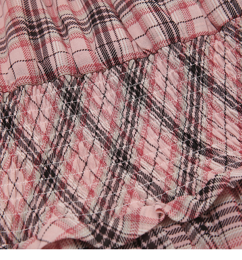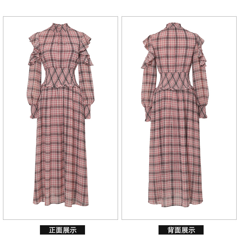 氣質立領 復古收腰大擺 經典格紋 荷葉邊裝飾 燈籠袖