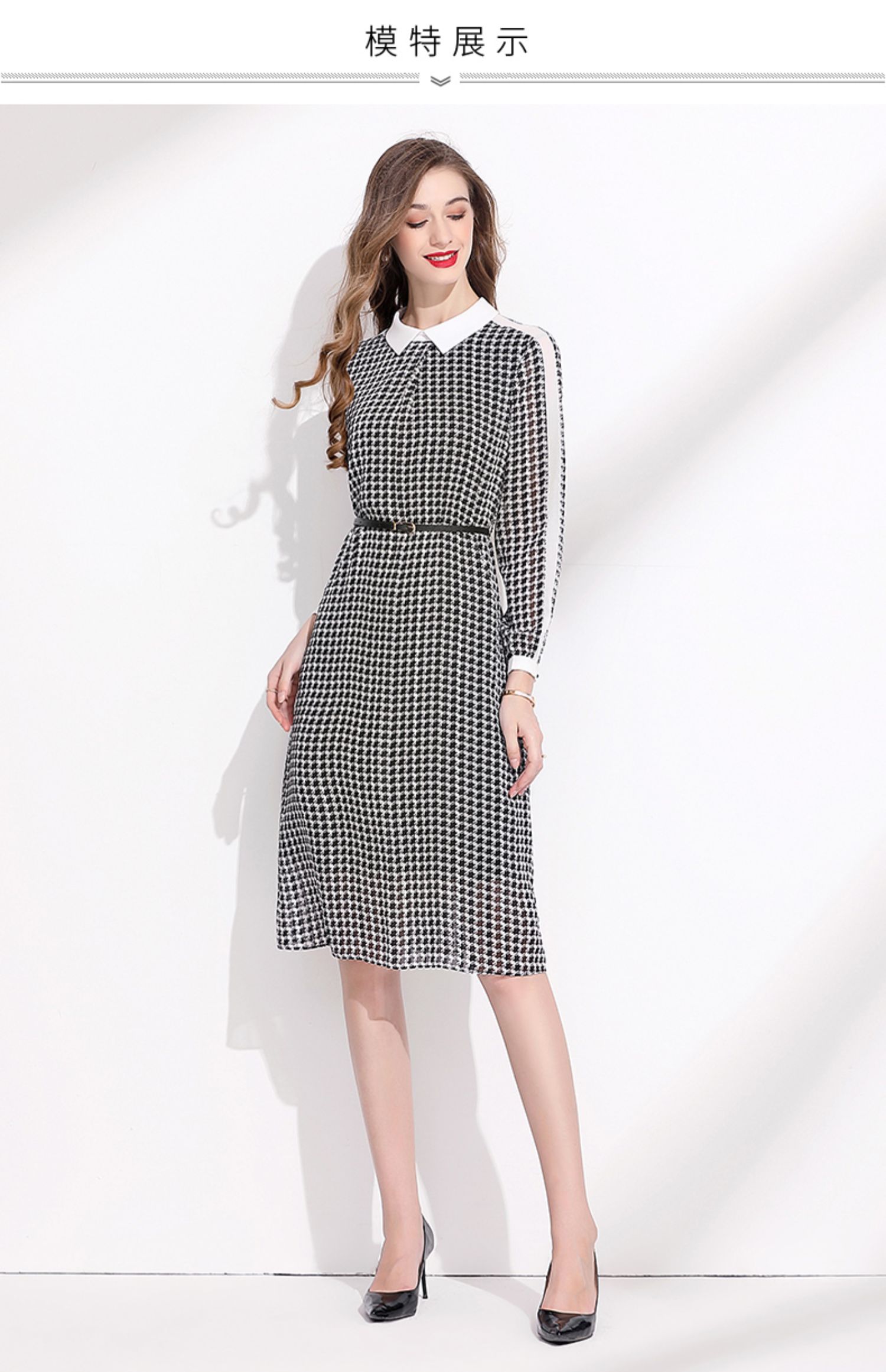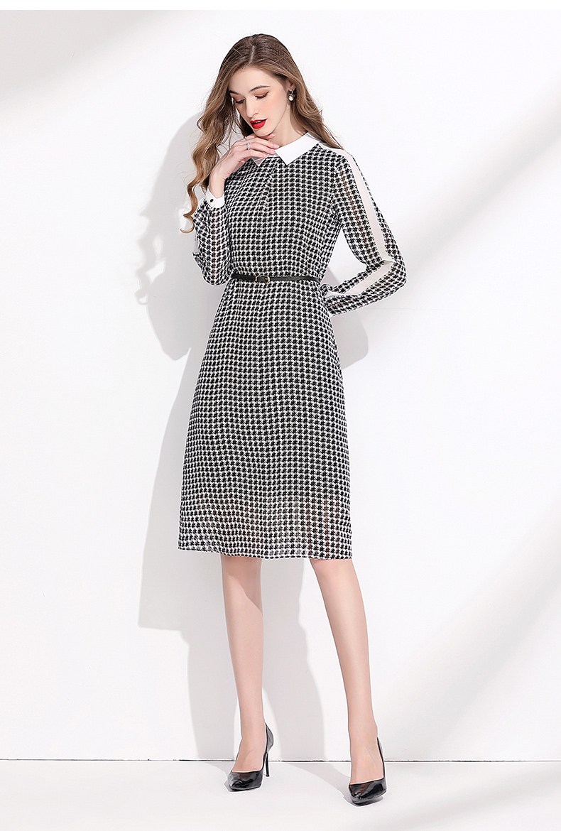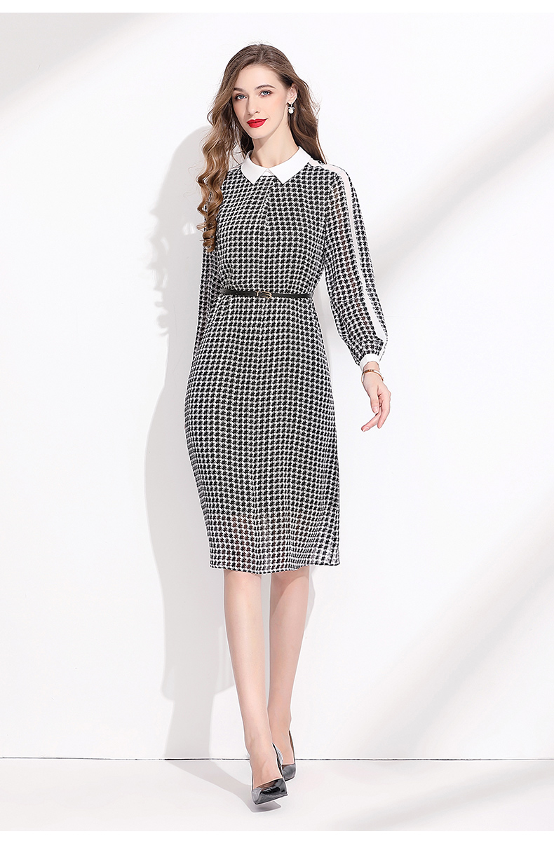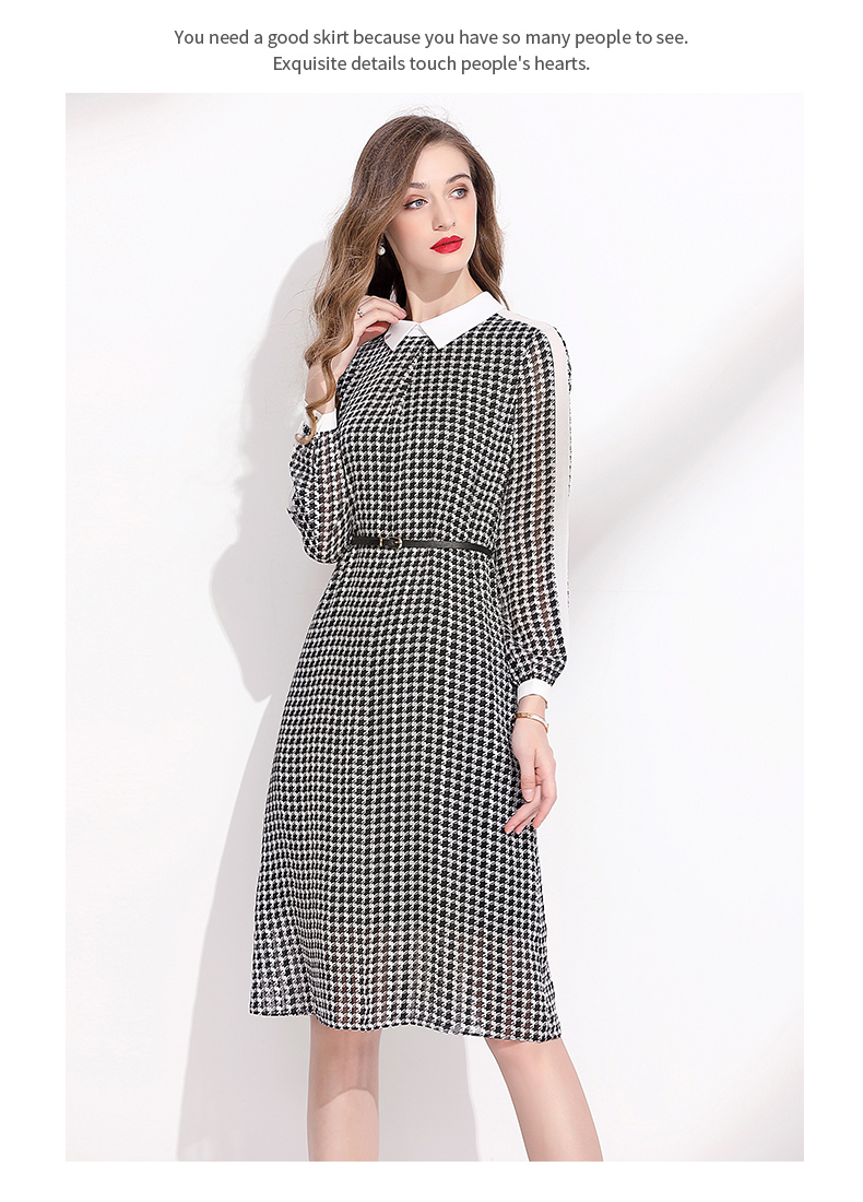 2023秋季新款撞色拼接翻領系帶收腰復古千鳥格雪紡連衣裙女秋長袖