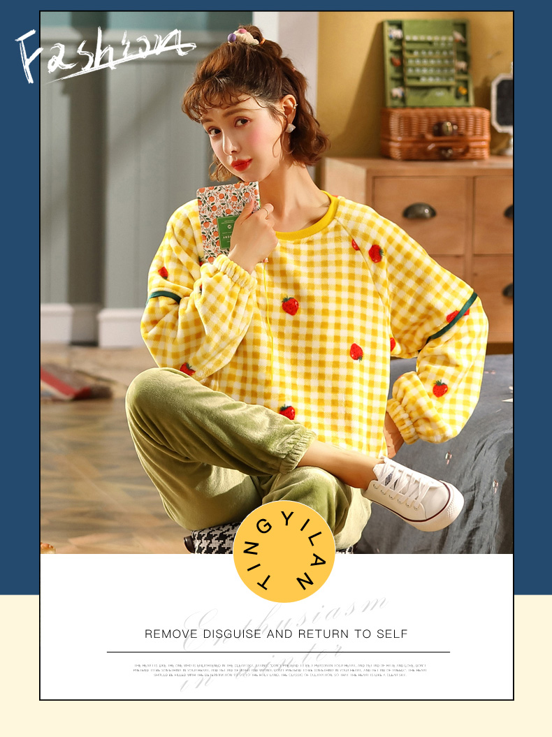 黃色格子草莓可愛加厚法蘭絨睡衣