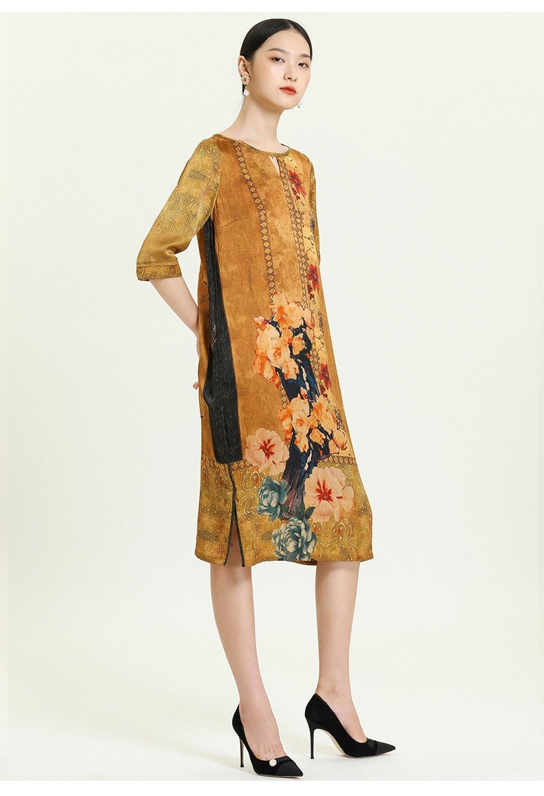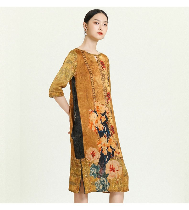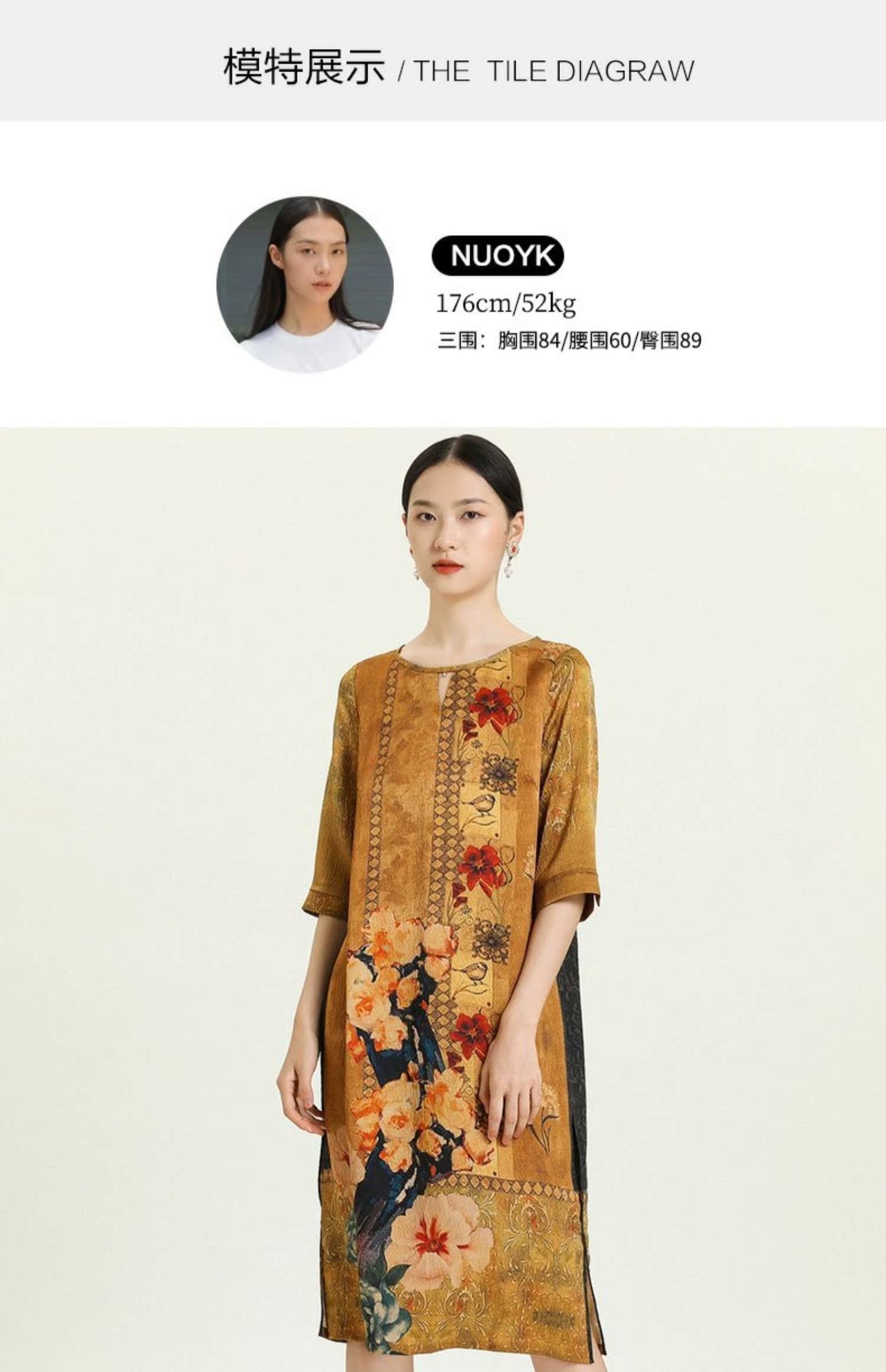 喬萬尼商場秋裝新款女裝真絲連衣裙寬松時尚復古印花桑蠶絲中長裙