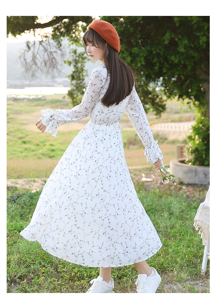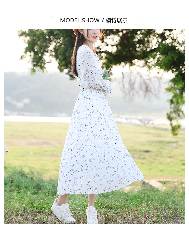 白色碎花雪紡春秋季收腰顯瘦長裙
