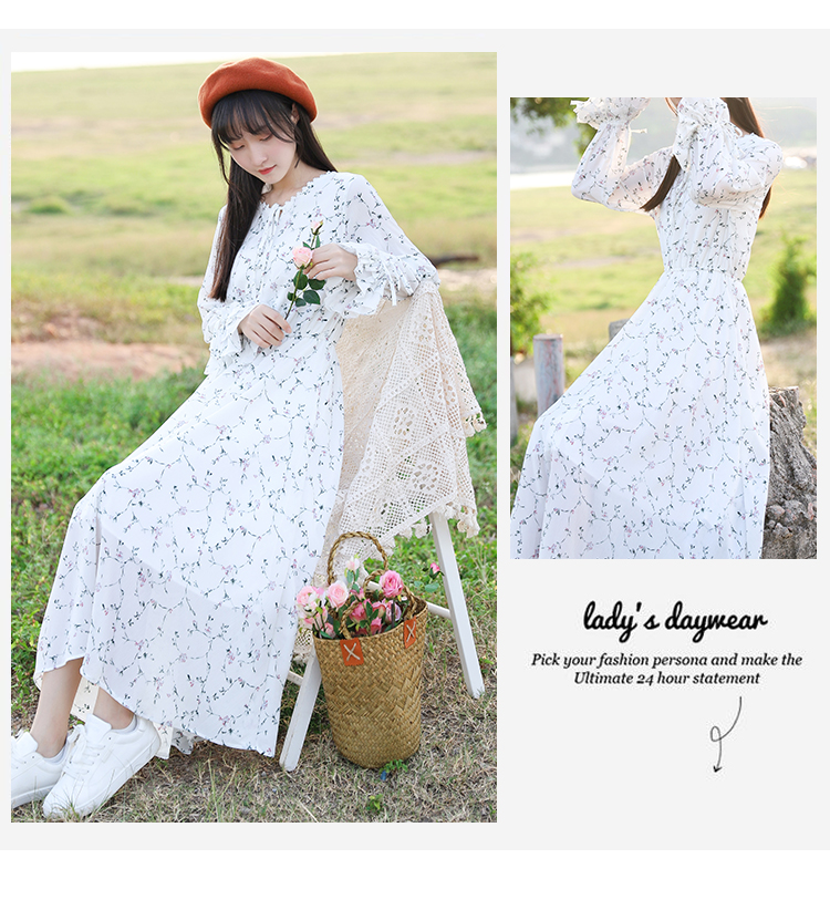 白色碎花裙女氣質長袖雪紡連衣裙顯瘦長裙學生田園風裙子秋季新款