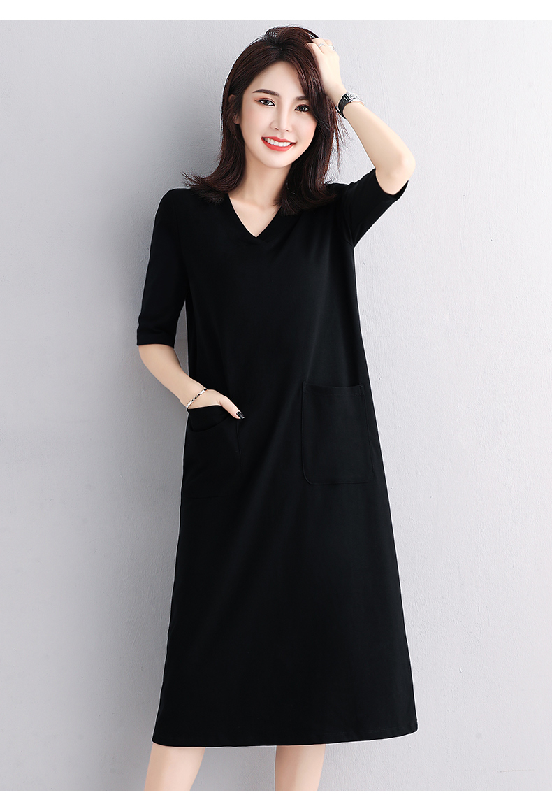黑色寬松休閑中袖連衣裙女中長款春夏季新款V領高級感氣質打底裙