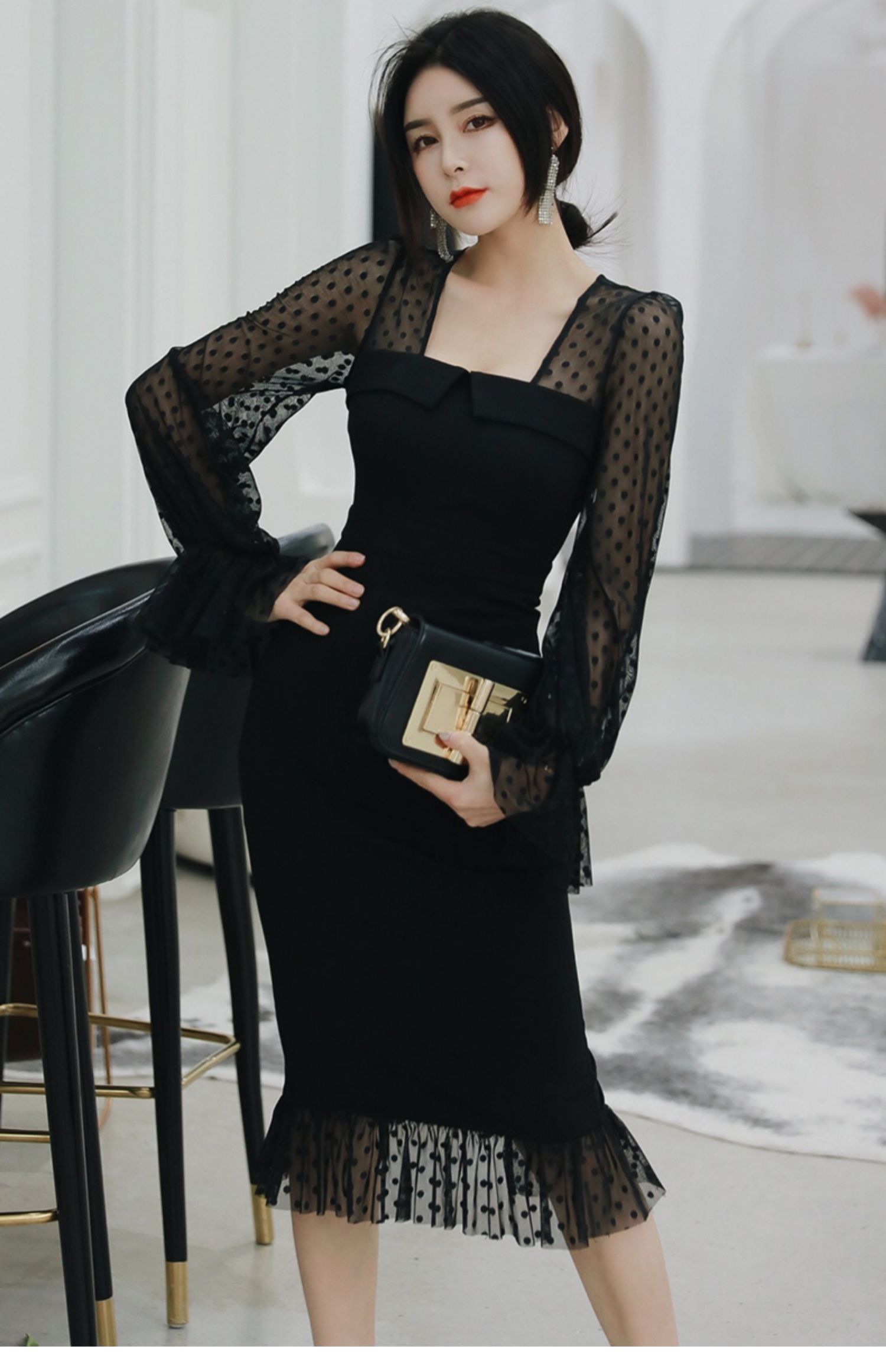 黑色網紗打底魚尾裙子2023秋裝新款女人味氣質性感方領包臀連衣裙