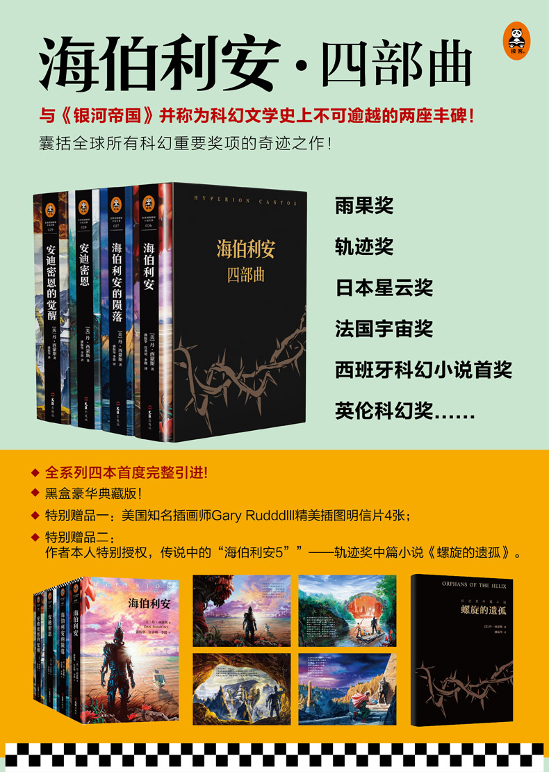 《海伯利安四部曲》包括《海伯利安》《海伯利安的隕落》《安迪密恩》《安迪密恩的覺醒》,與《銀河帝國》并稱為科幻文學不可逾越的兩座豐碑。于1989年初次出版后,橫掃所有科幻重要獎項的奇跡之作:雨果獎、軌跡獎、日本星云獎、法國宇宙獎、西班牙科幻小說獎、英倫科幻獎……被《軌跡》雜志票選為1990年前史上十大科幻小說,1997年和2006年兩次入選“100部科幻奇幻作品榜”。