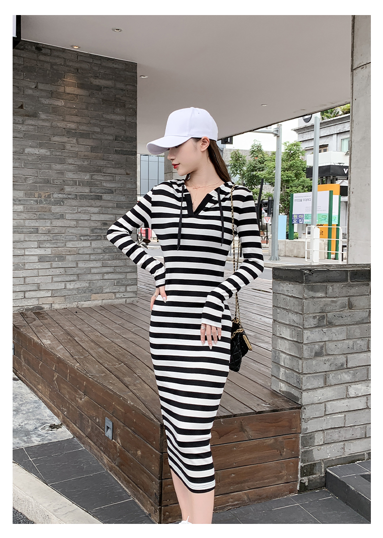 條紋連帽衛衣裙女中長款氣質收腰打底包臀連衣裙2023新款春秋女裝