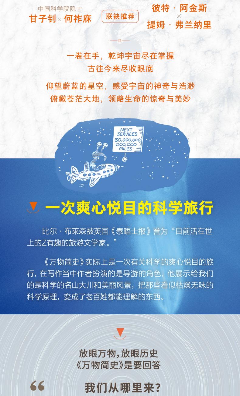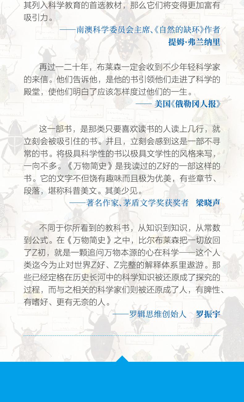 本書在講述科學的奇跡與成就的同時,還浸潤著濃郁的悲天憫人的人文關懷。全書從科學發展史的角度對“我們從哪里來?我們是誰?我們到哪里去?”這一千古命題作了極為精當的闡釋,每一個人在閱讀此書之后,都會對生命、對人生、對我們所生活的世界產生全新的感悟。一位美國小讀者的父親說,讀過《萬物簡史》之后,他對死亡不再感到恐懼……作者認為,這是一本書所能獲得的*評價。