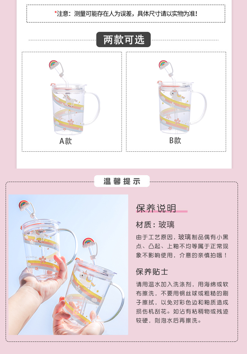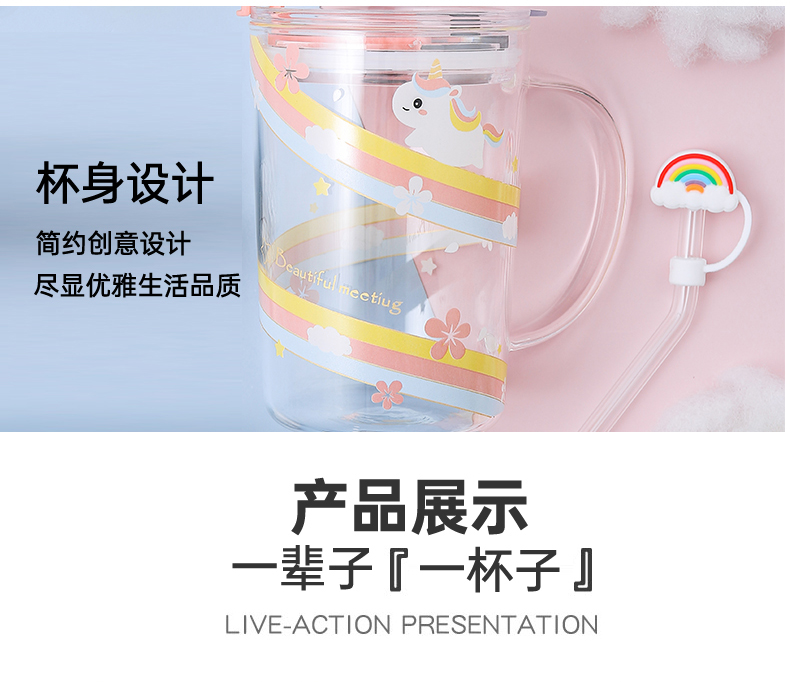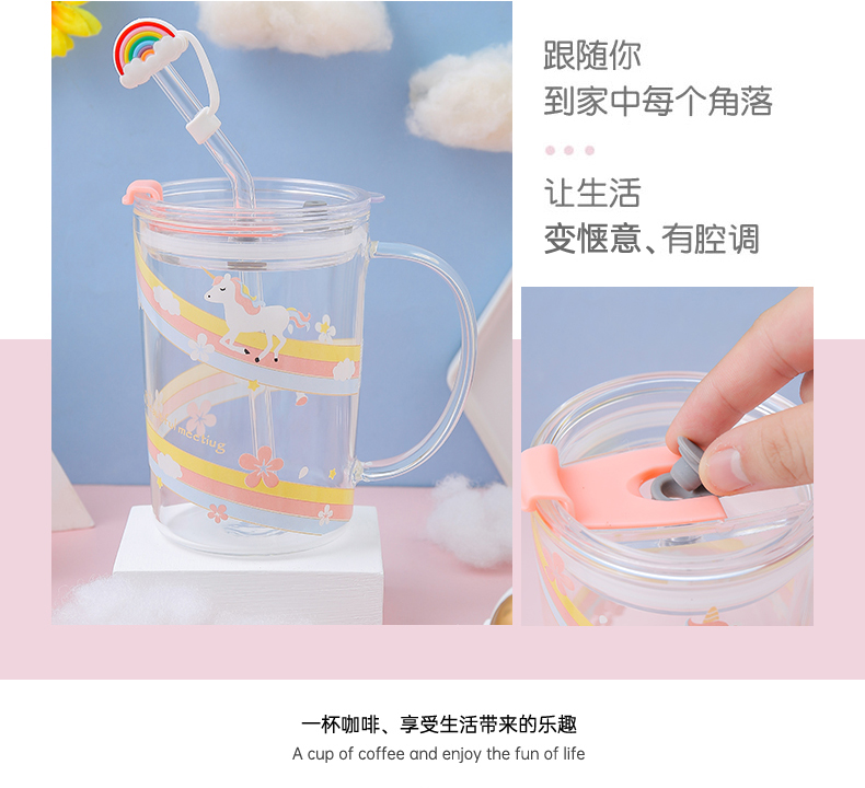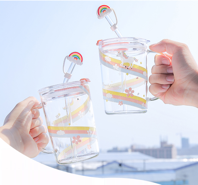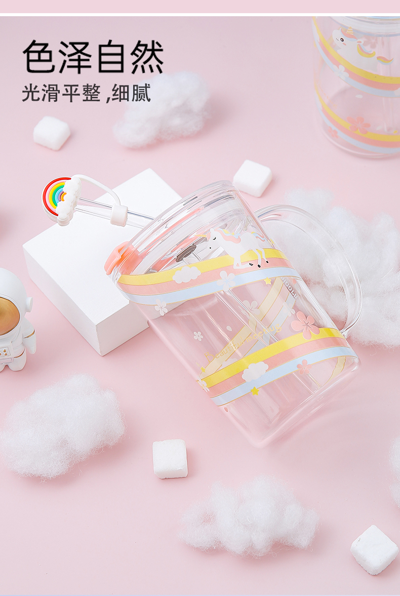 可愛彩虹獨角獸馬克杯透明玻璃杯帶蓋大容量水杯子吸管牛奶咖啡杯