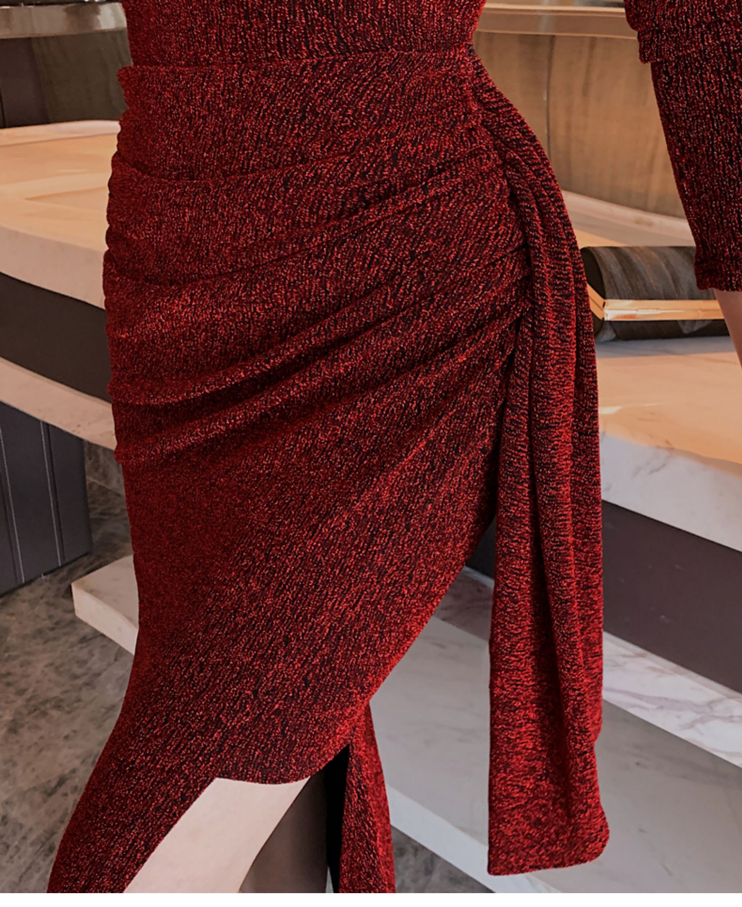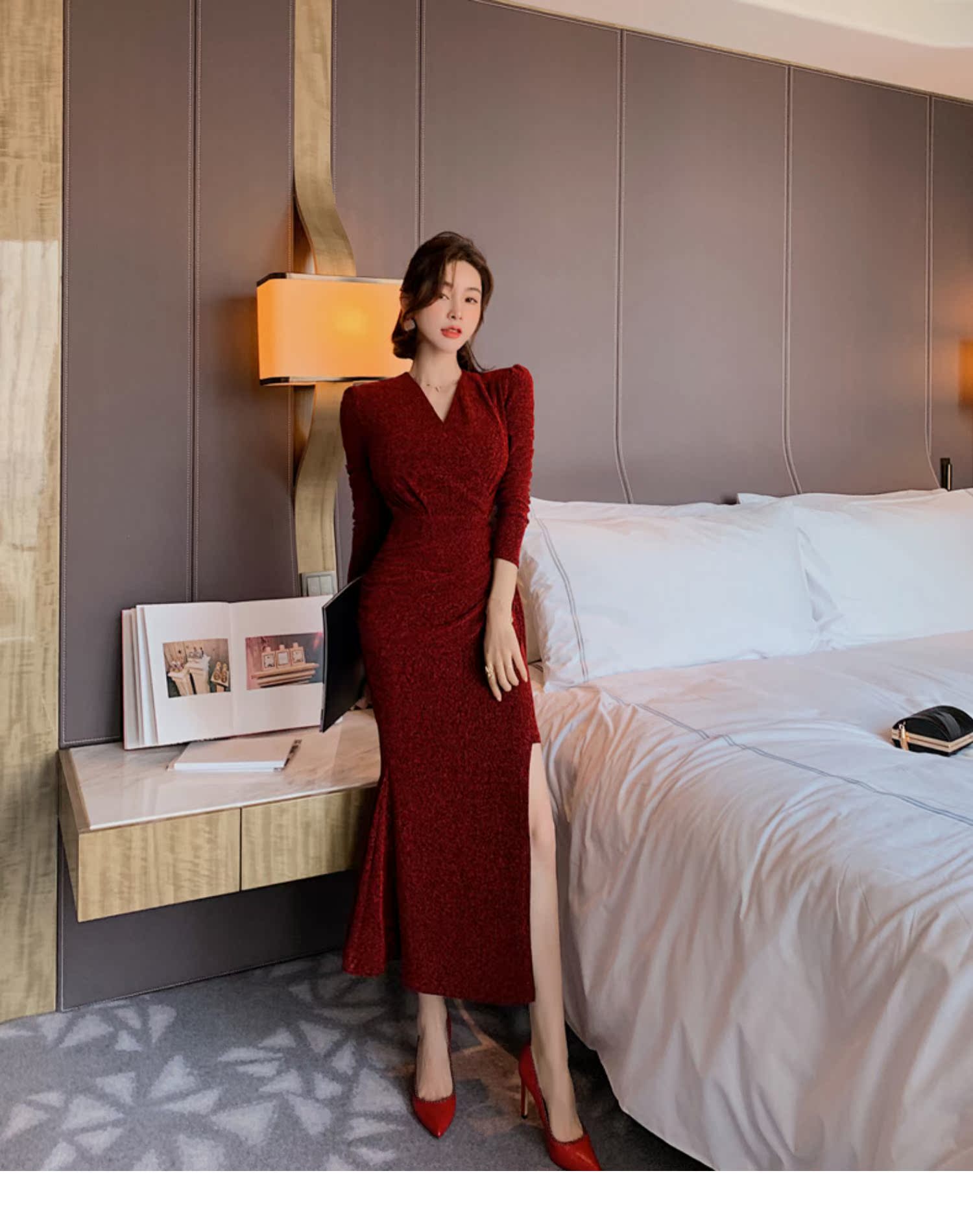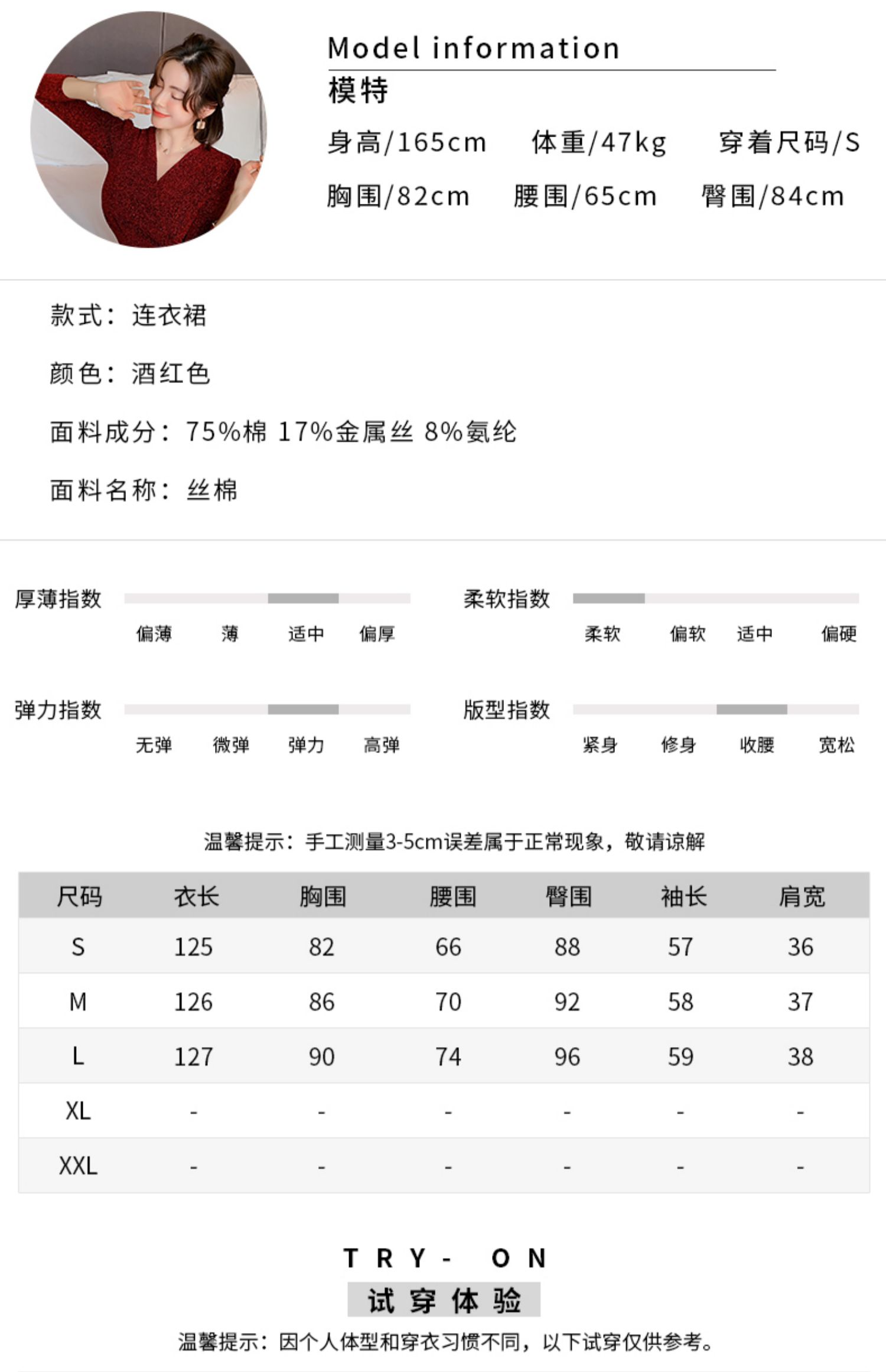 酒紅色晚禮服平時可穿復古長袖秋裝V領收腰氣質配大衣的連衣裙