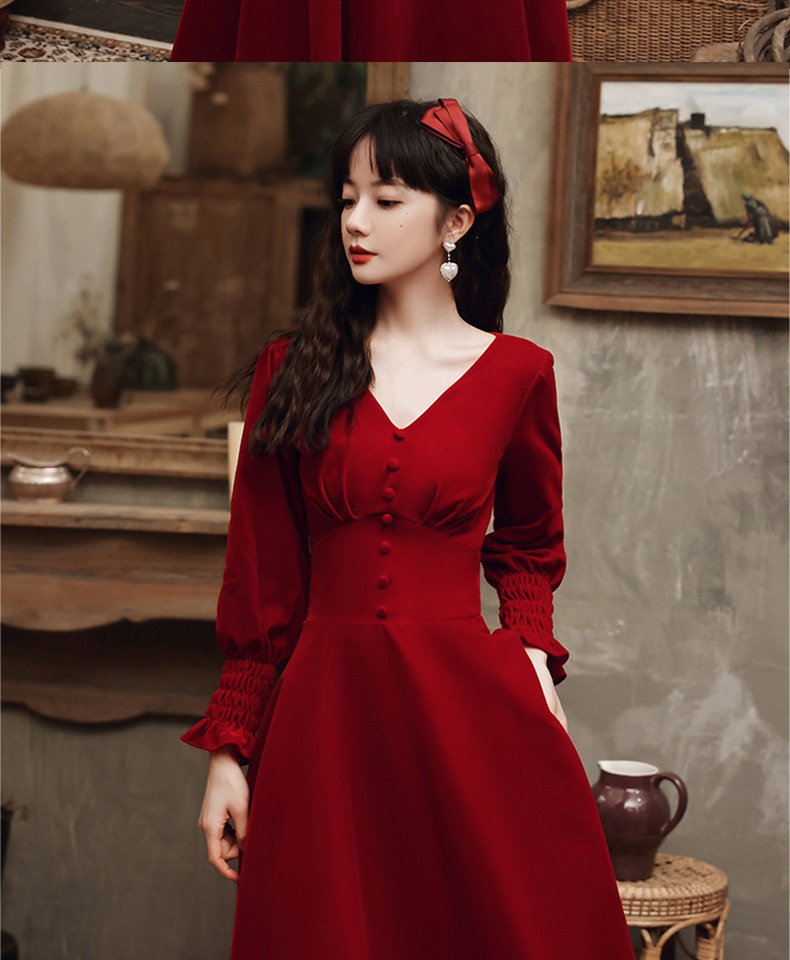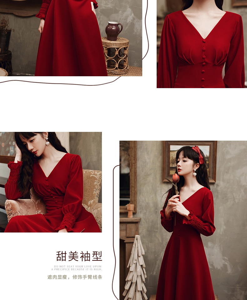 v領敬酒服新娘酒紅色平時可穿訂婚禮裙泡泡袖小紅裙高級感連衣裙
