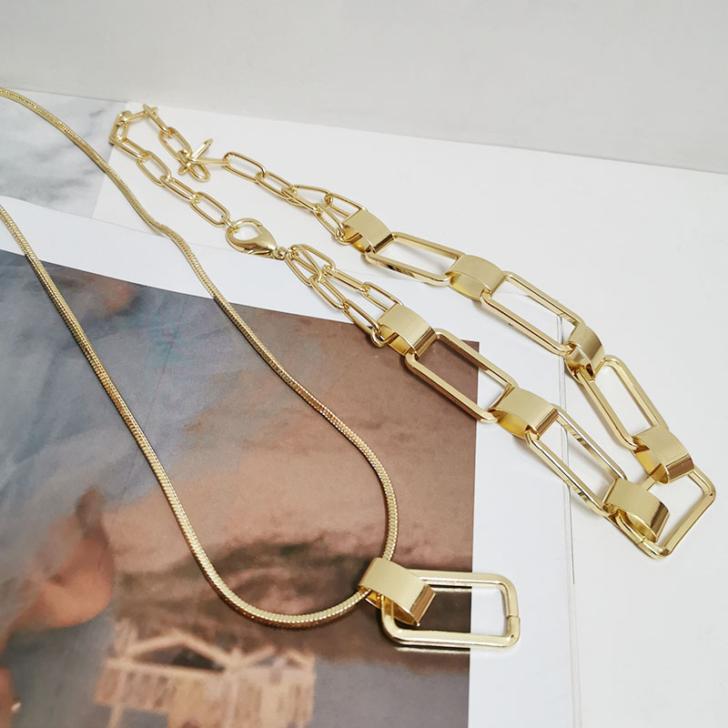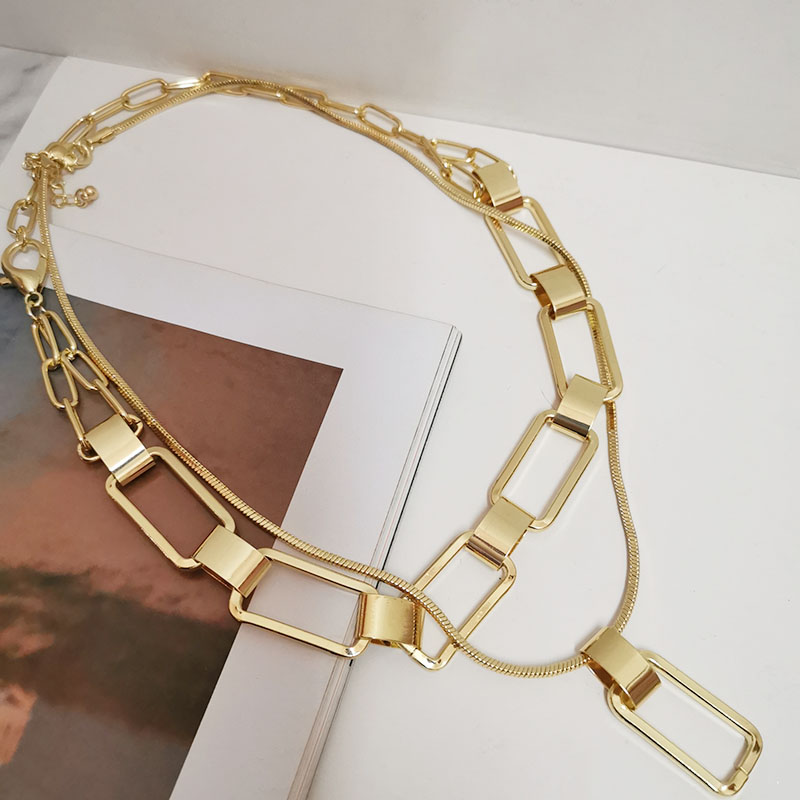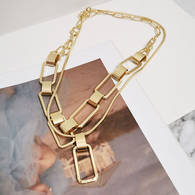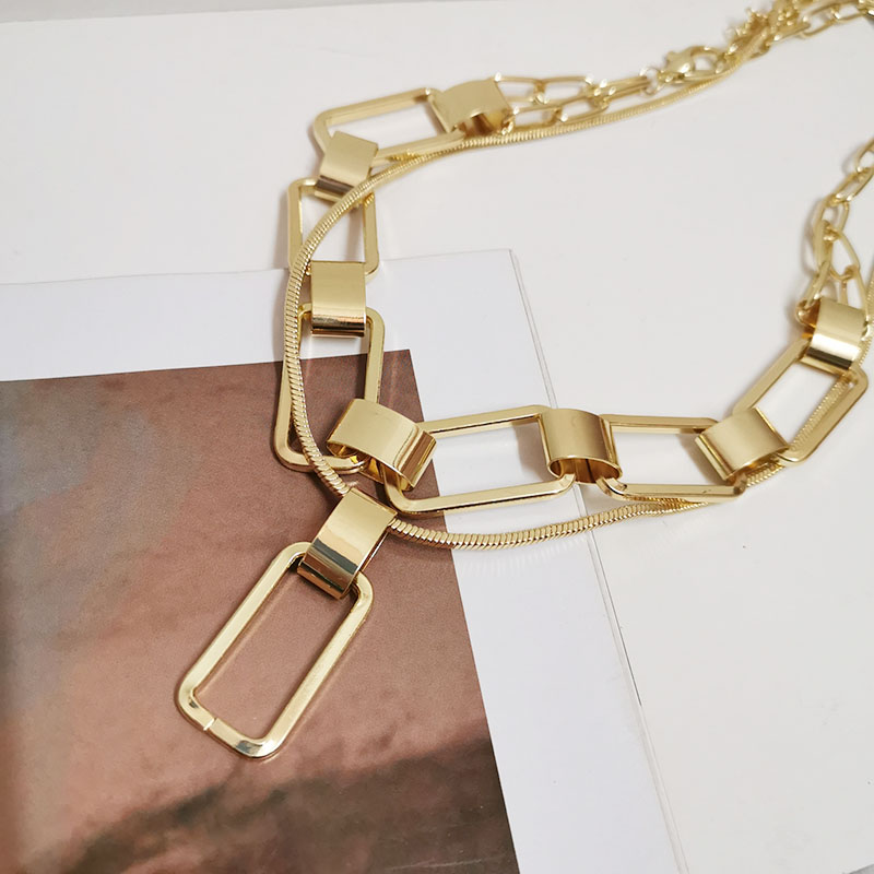 歐美夸張網紅嘻哈幾何方形金色多層粗鏈條項鏈女鎖骨鏈雙層頸鏈女