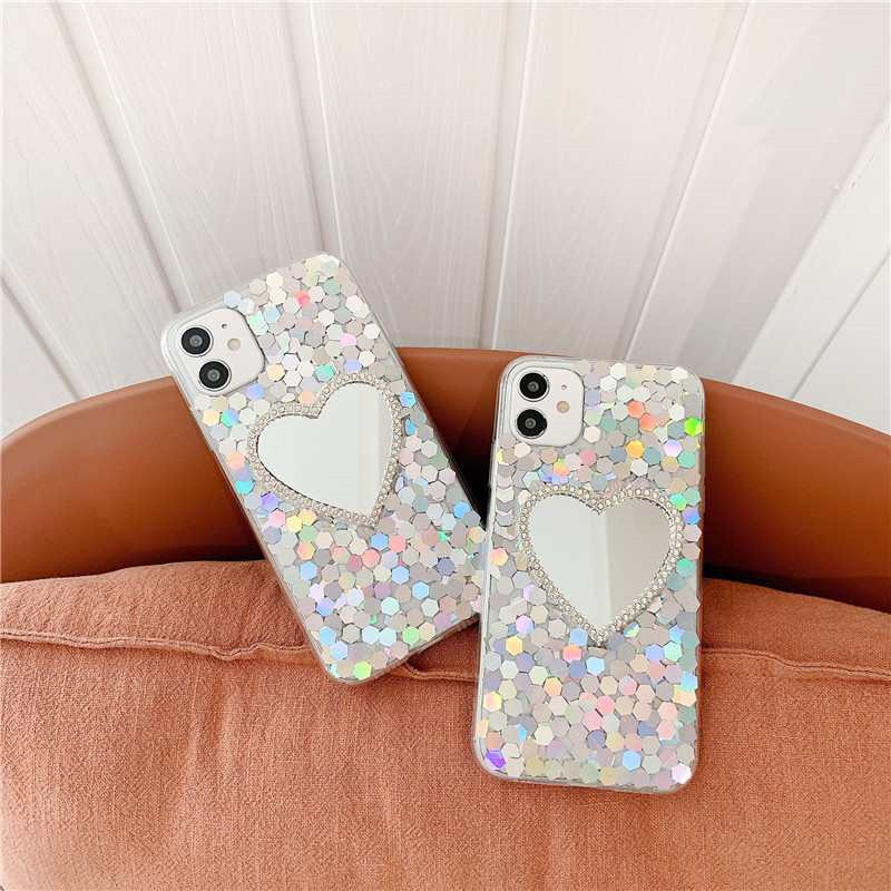 亮片桃心鏡子適用于蘋果15 14pro 13pro手機殼11/xsmax滴膠se保護套12/8plus