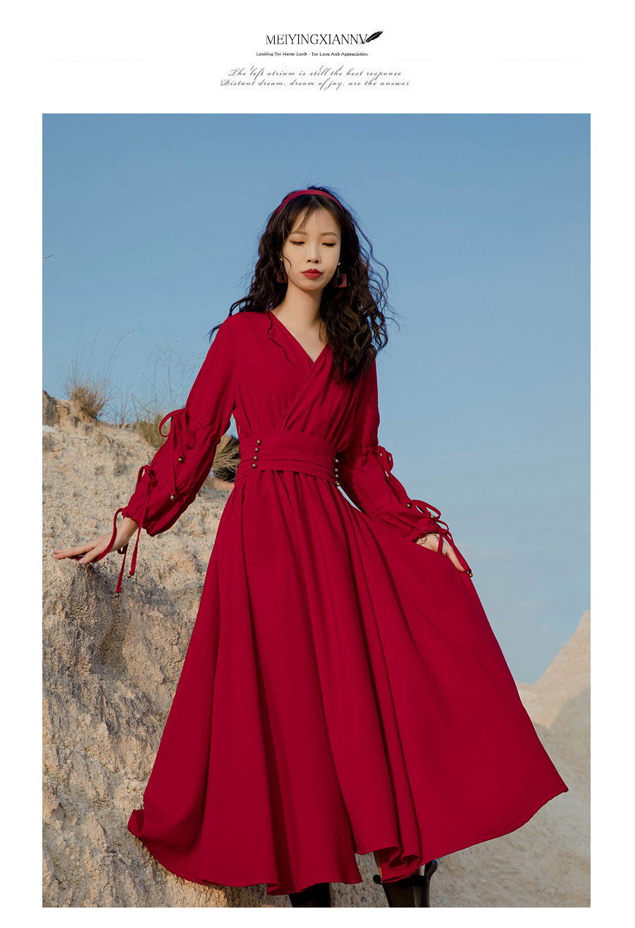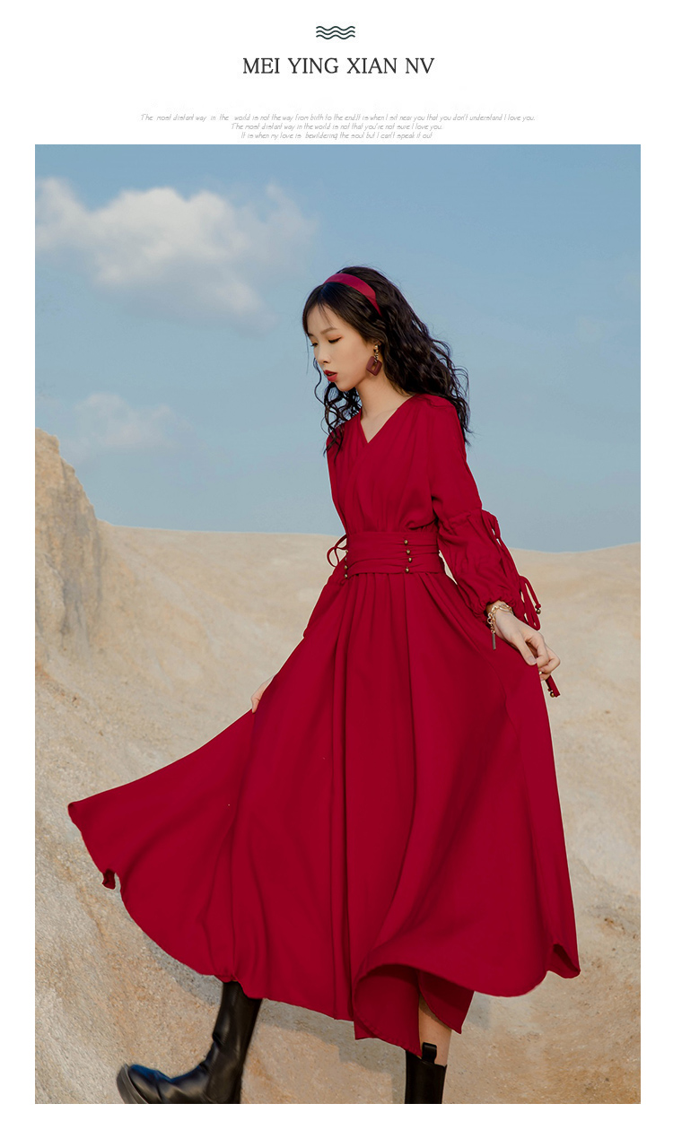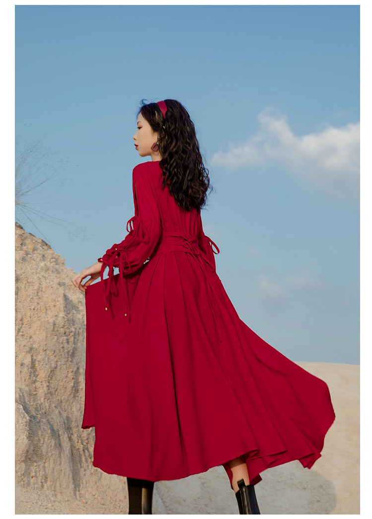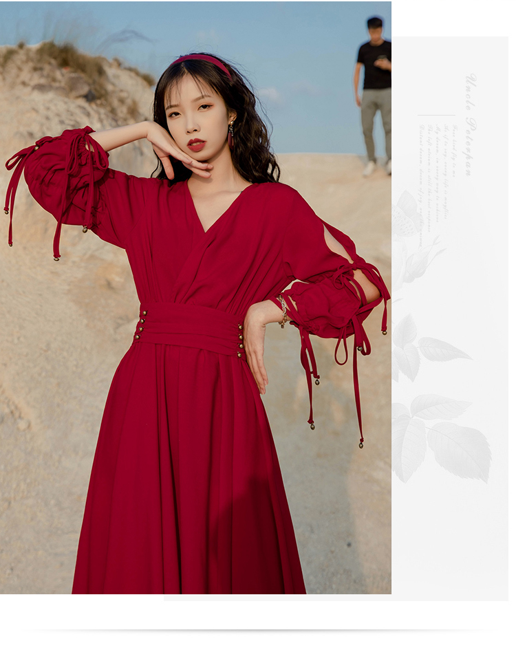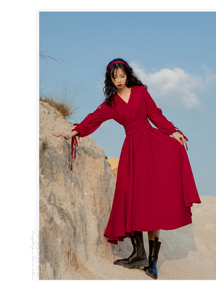 法式復古紅色雪紡長袖茶卡鹽湖長裙