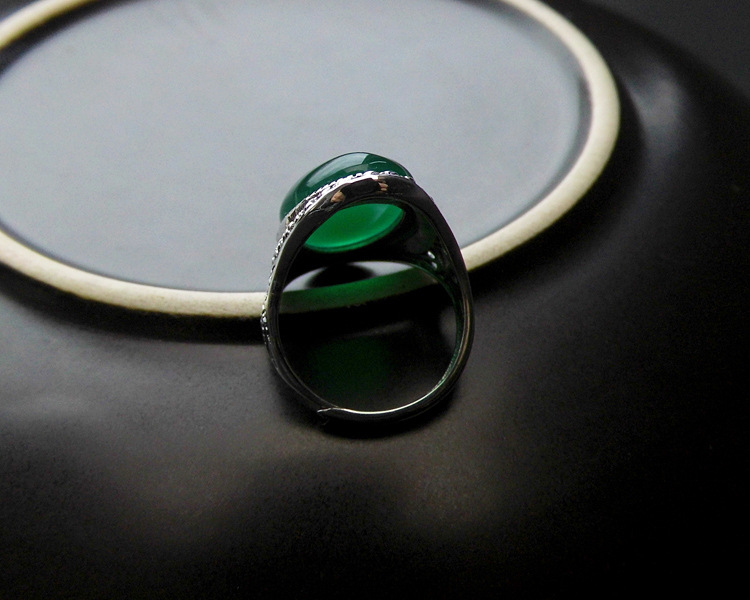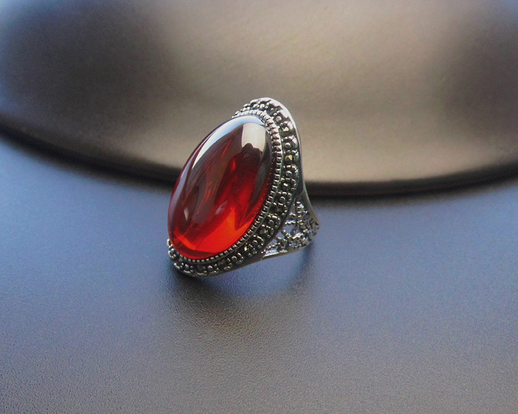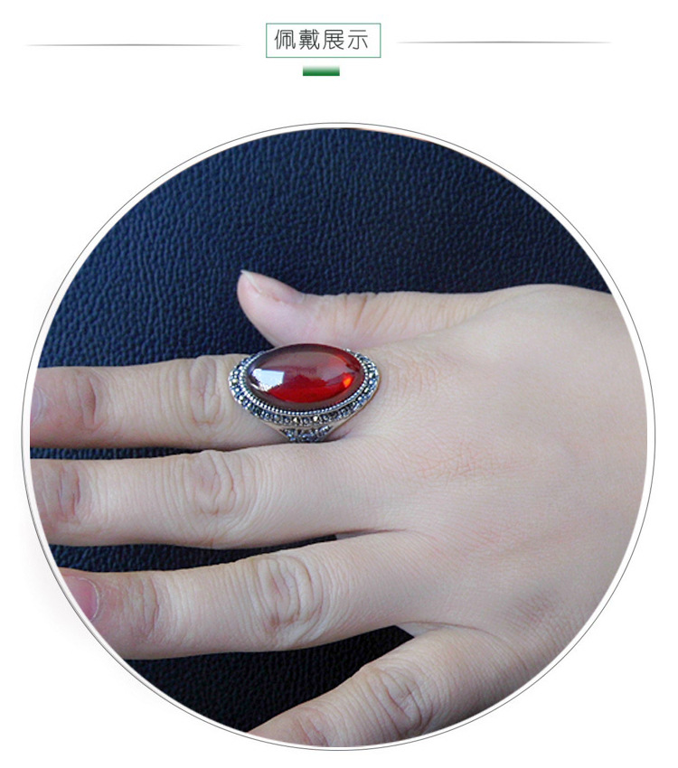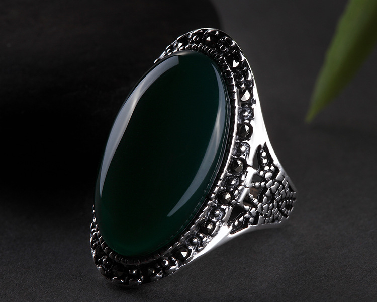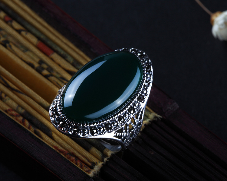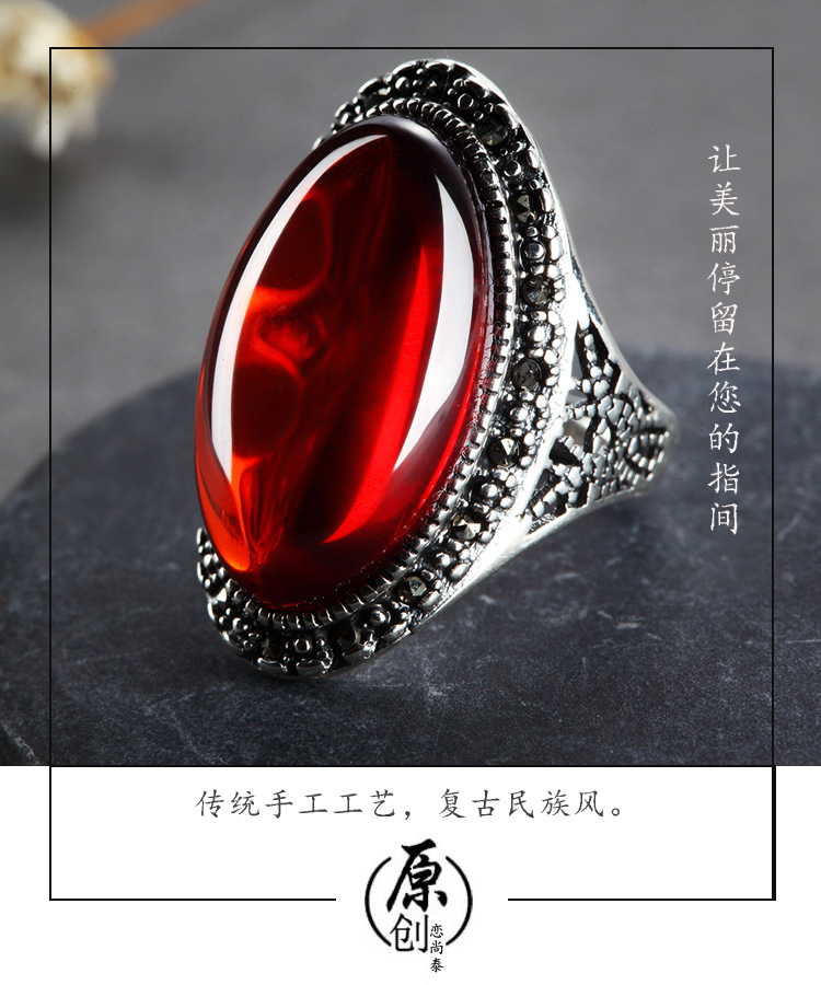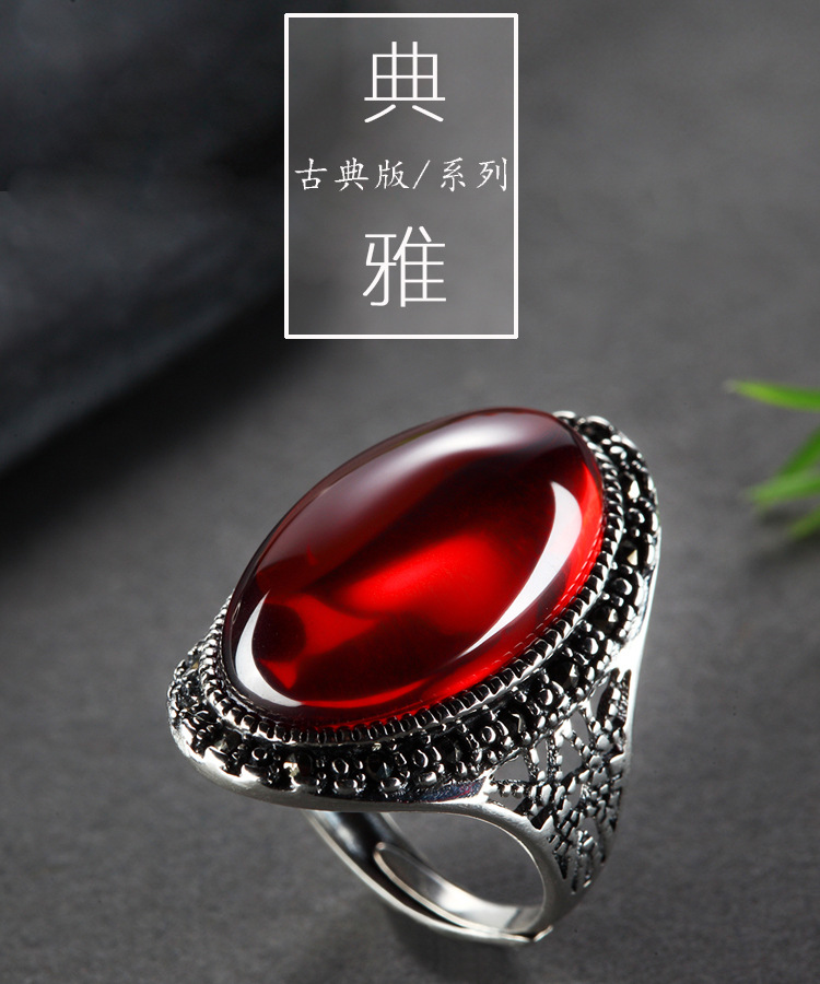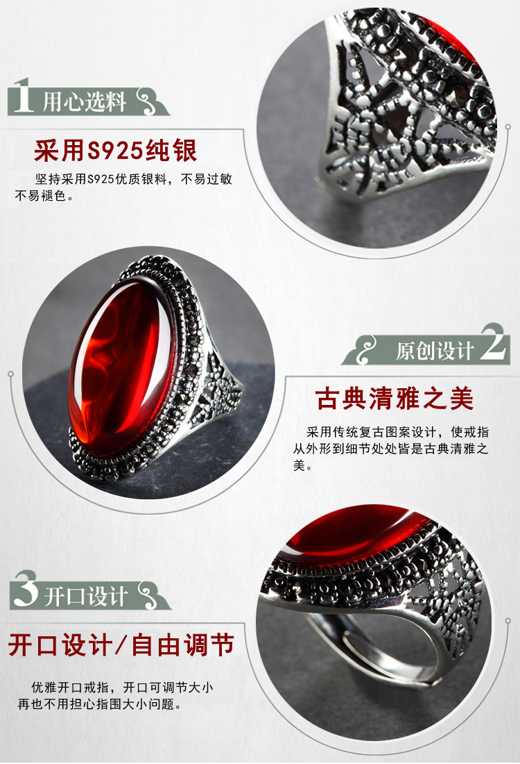 戀尚泰S925銀飾品長款個性夸張紅石榴開口戒指女大氣綠瑪瑙食指環