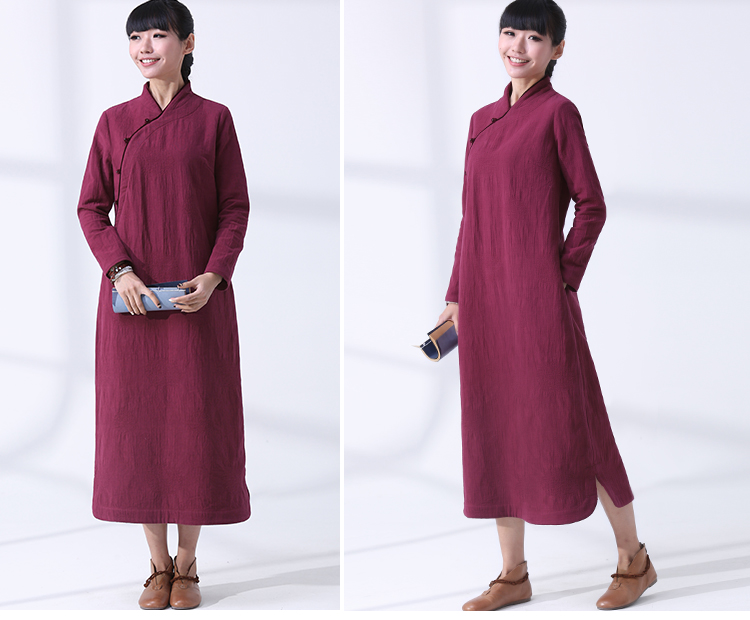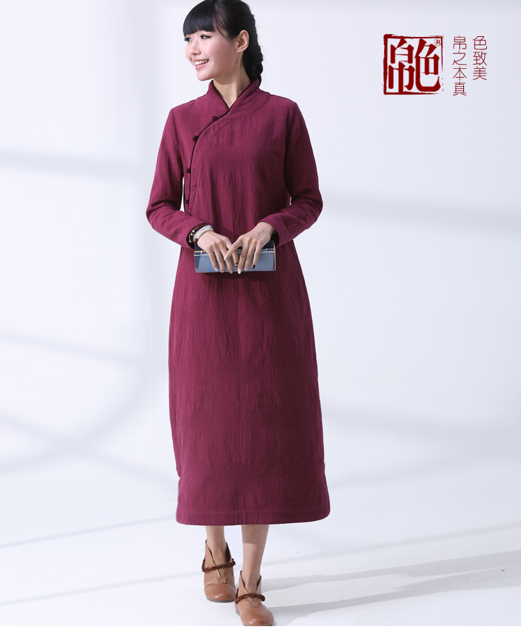 帛色春秋款新中式立領旗袍長袖紅色長袍套頭顯瘦復古文藝袍裙厚款