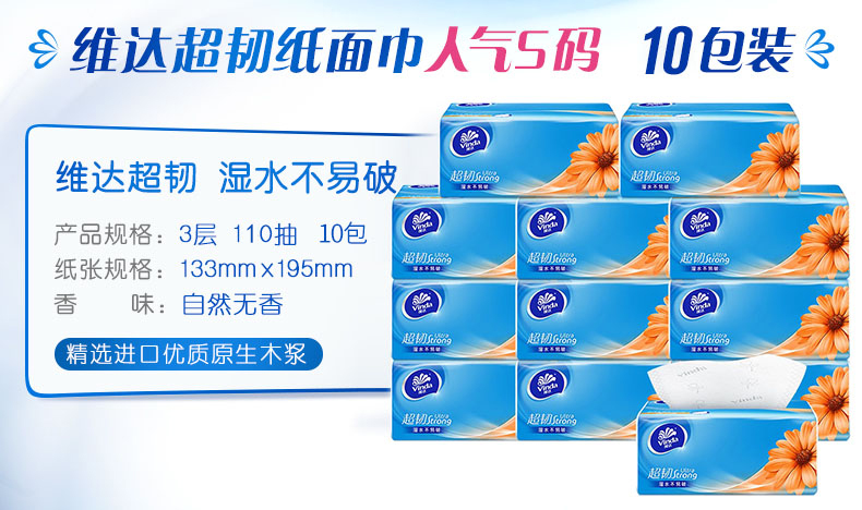 維達超韌抽紙家用衛生紙巾3層110抽10包 家庭實惠裝面巾紙餐巾紙