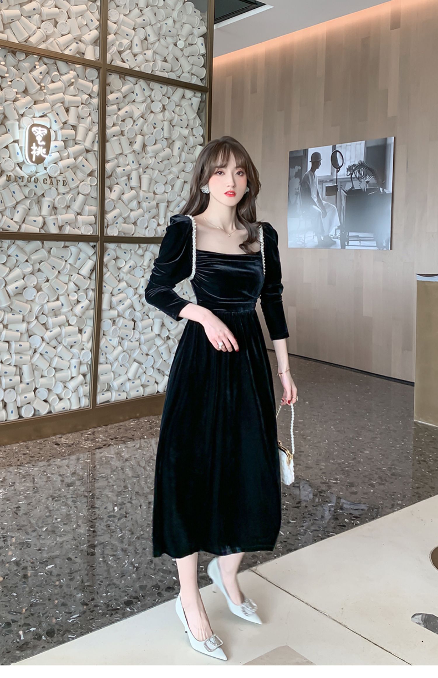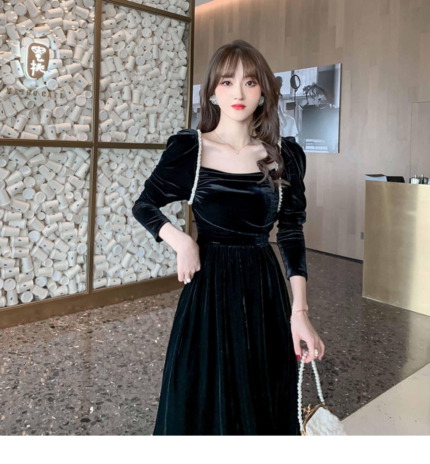 珍珠鏈赫本風優雅氣質禮服女連衣裙