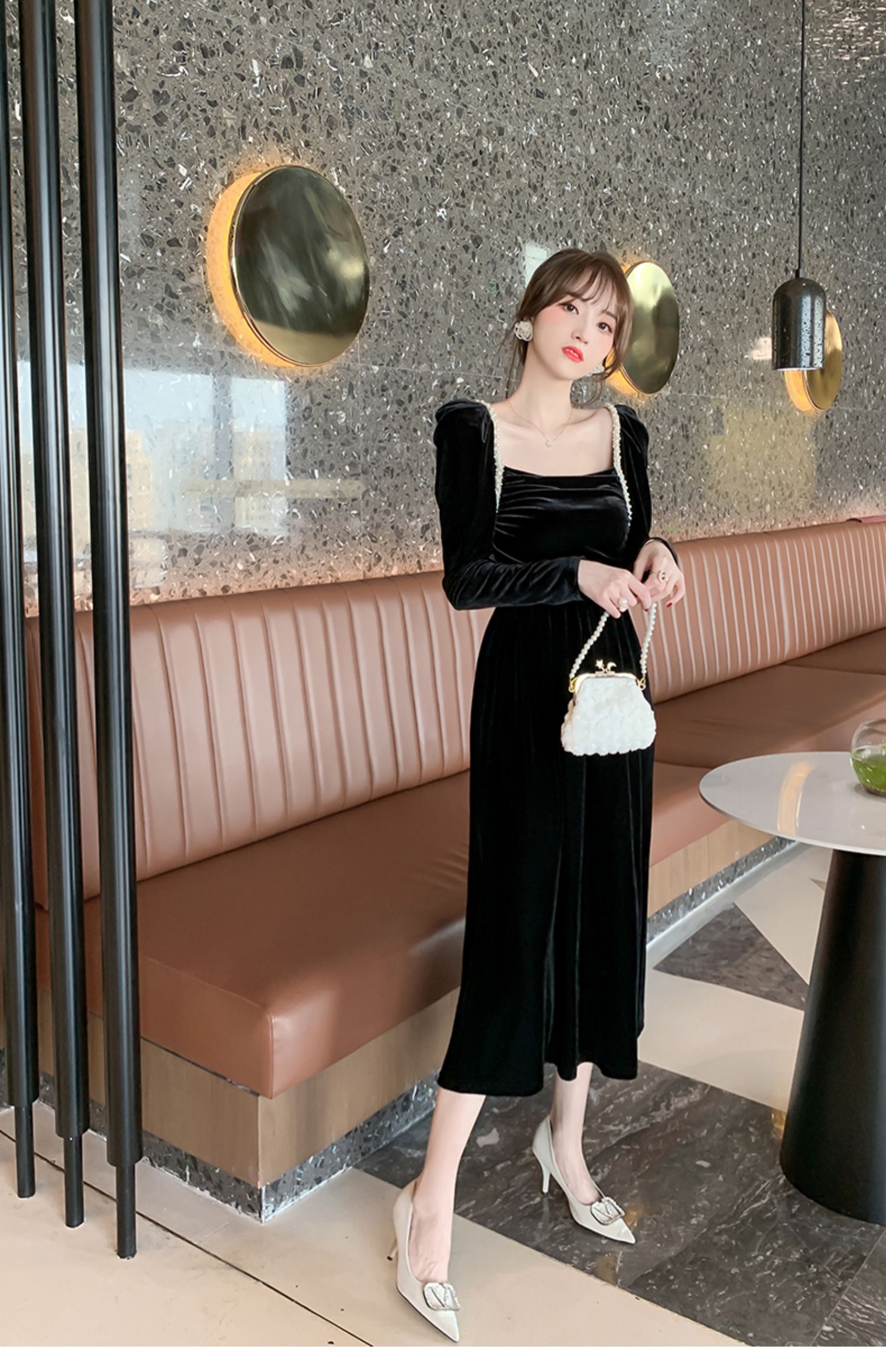 娃娃領晚禮服女宴會絲絨包臀連衣裙