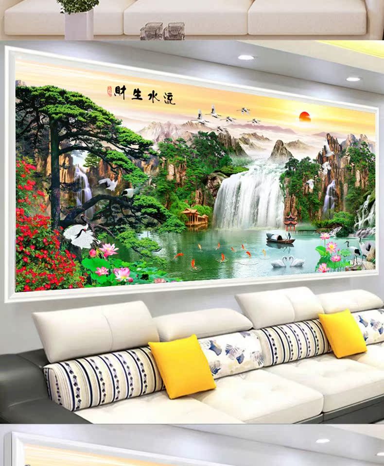 2023新款鉆石畫客廳滿鉆流水生財風景山水磚石畫貼鉆十字繡鉆石繡