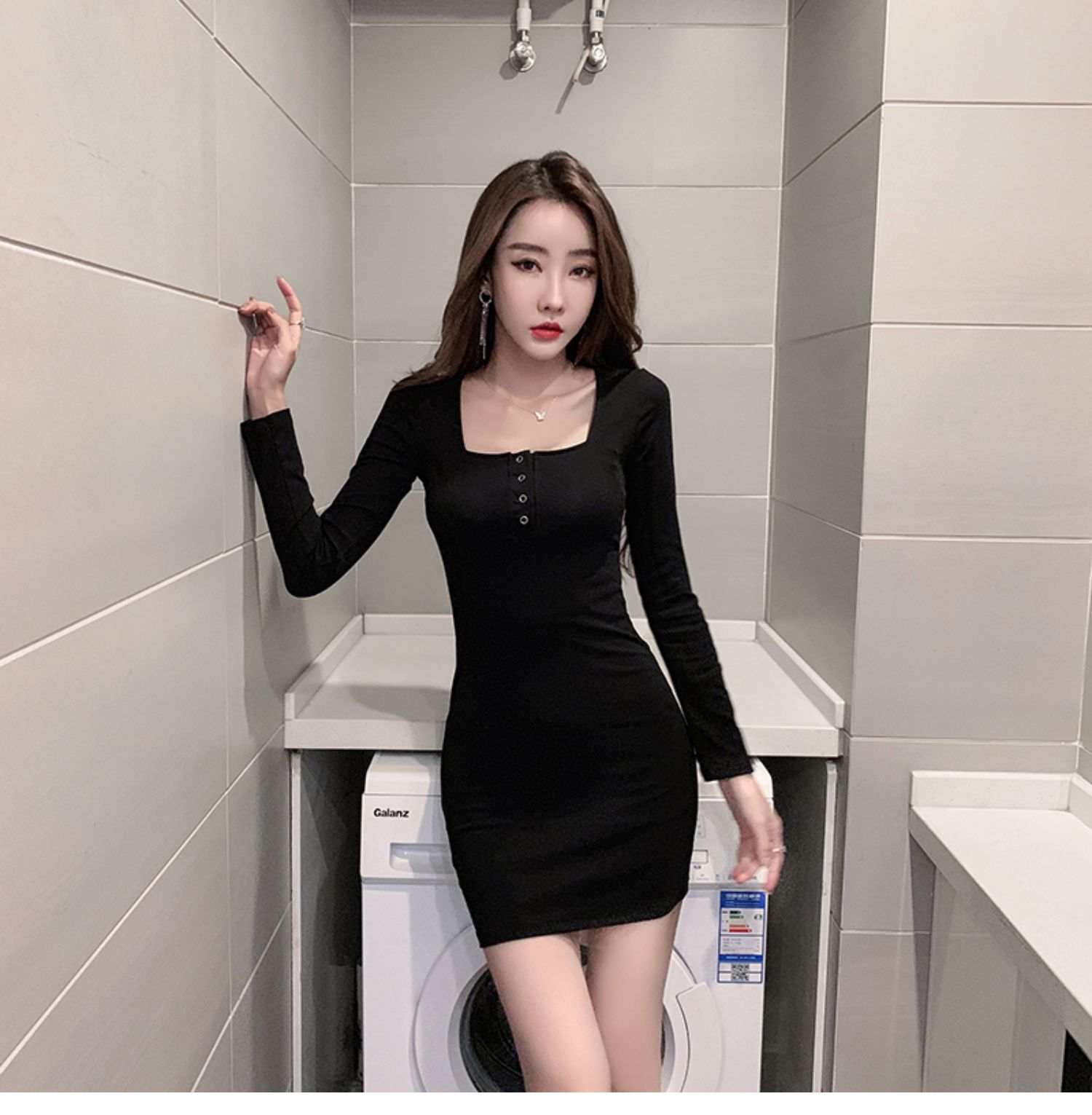 方領氣質緊身包臀裙女2023年秋裝新款修身長袖性感打底連衣裙短裙