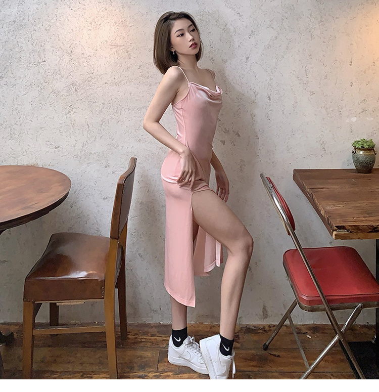 KLIOU自制 性感粉色吊帶裙氣質顯瘦鎖骨連衣裙心機開叉打底中長裙