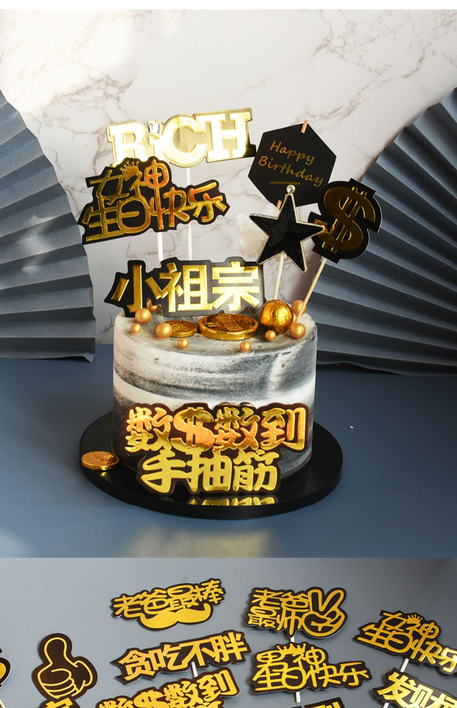 網紅蛋糕裝飾生日擺件男神女神發財要緊一夜暴富全村插件插牌插卡