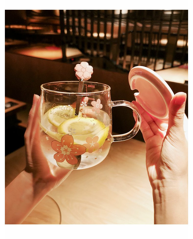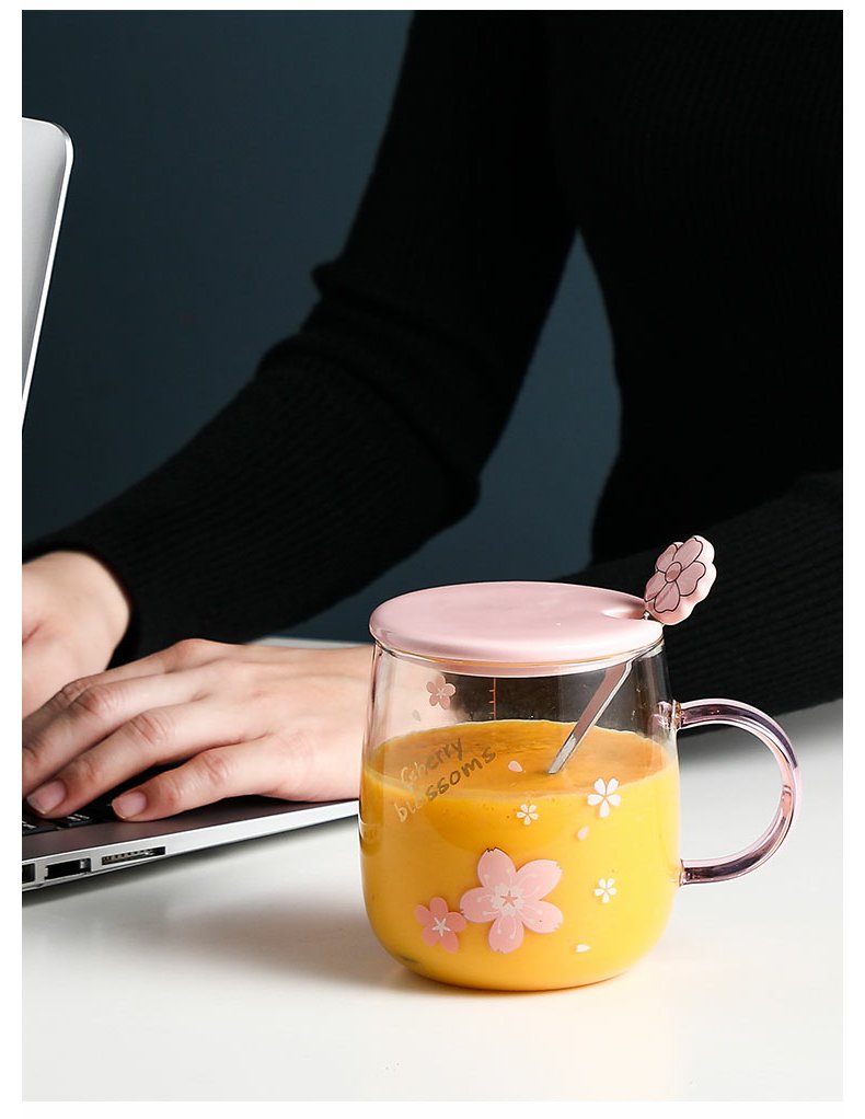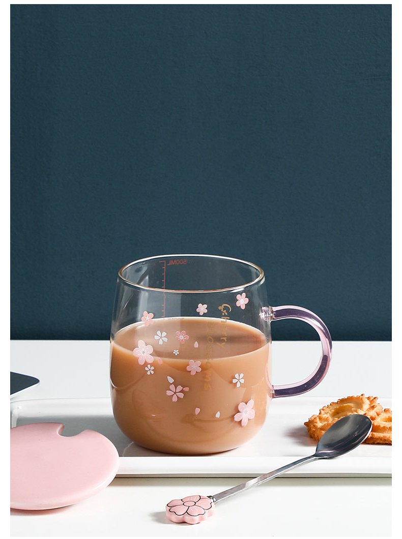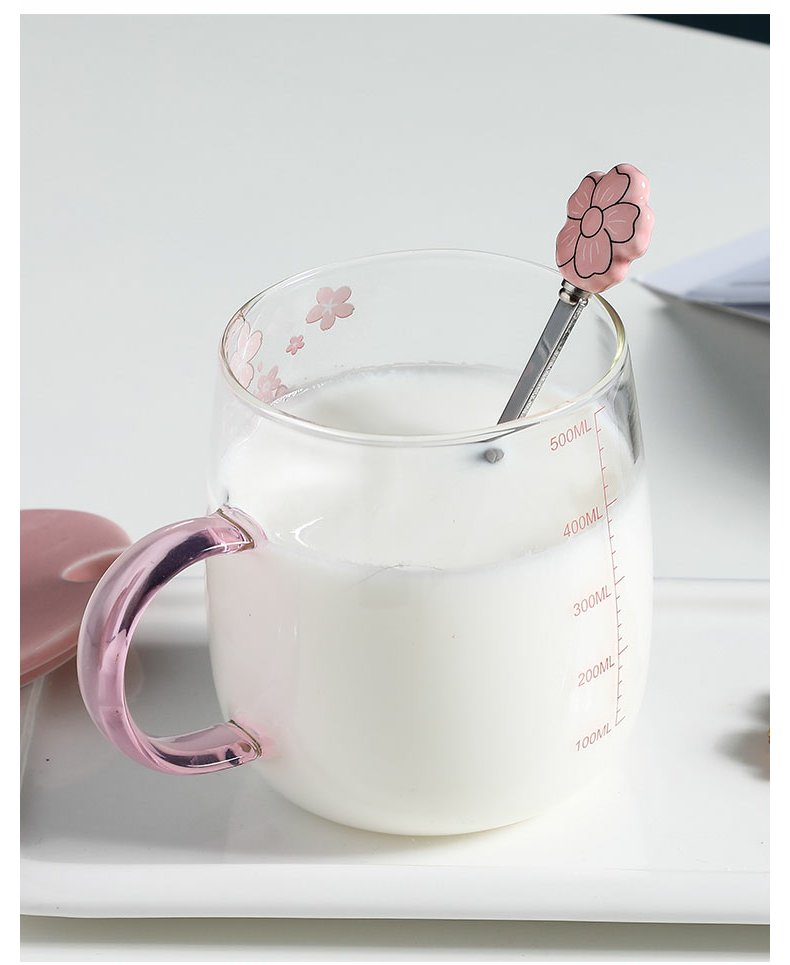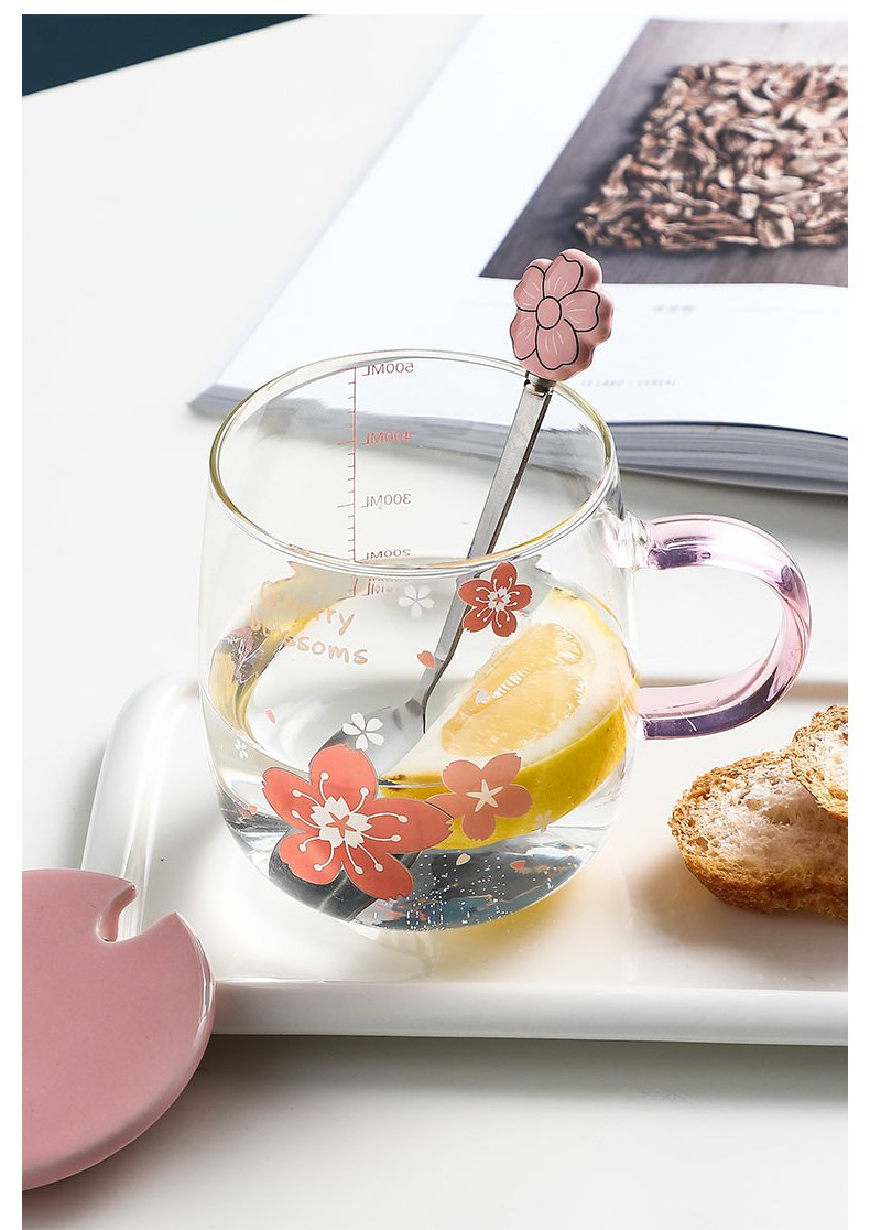 櫻花玻璃帶蓋勺花茶杯子刻度牛奶杯