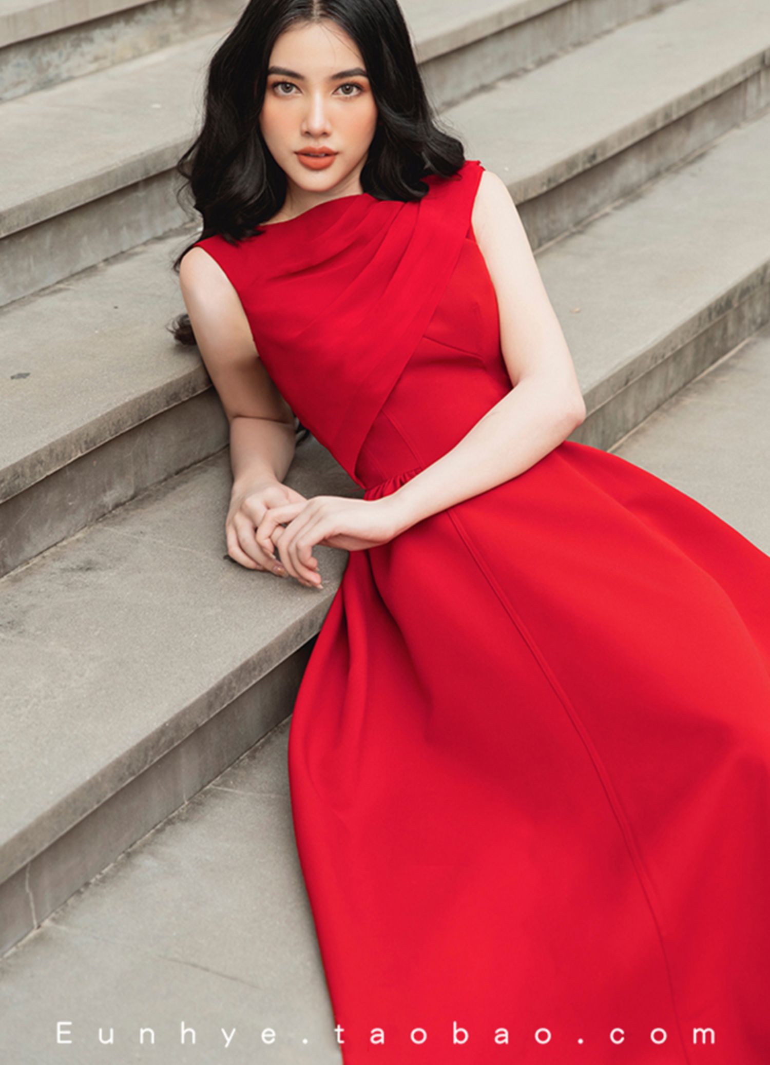 品牌授權 越南小眾CICI 2021ss新春無袖褶皺裙擺質感女神連衣裙
