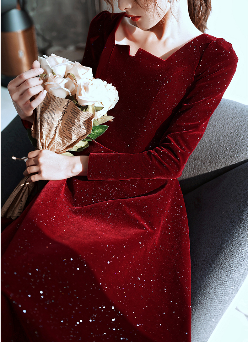 敬酒服新娘酒紅色平時可穿紅色禮服氣質絲絨長袖訂婚回門連衣裙女
