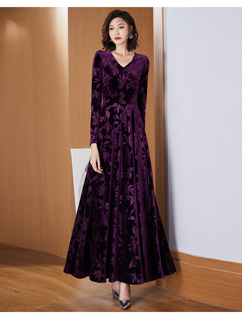 高級感植絨提花紫色連衣裙女2023初秋新款修身長袖顯瘦大擺長裙